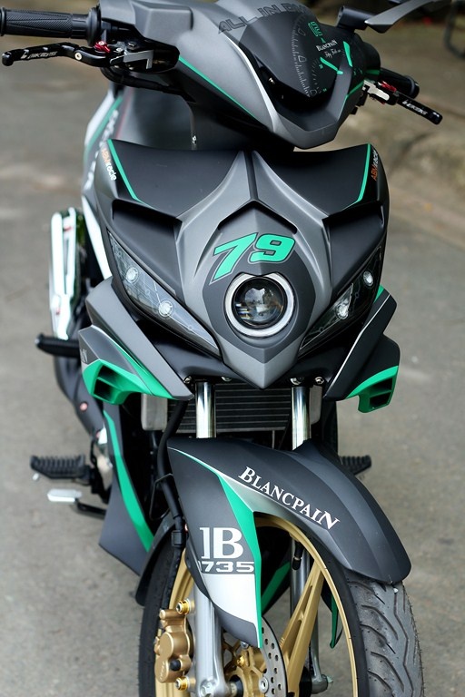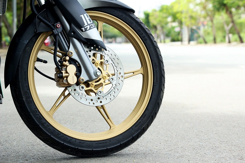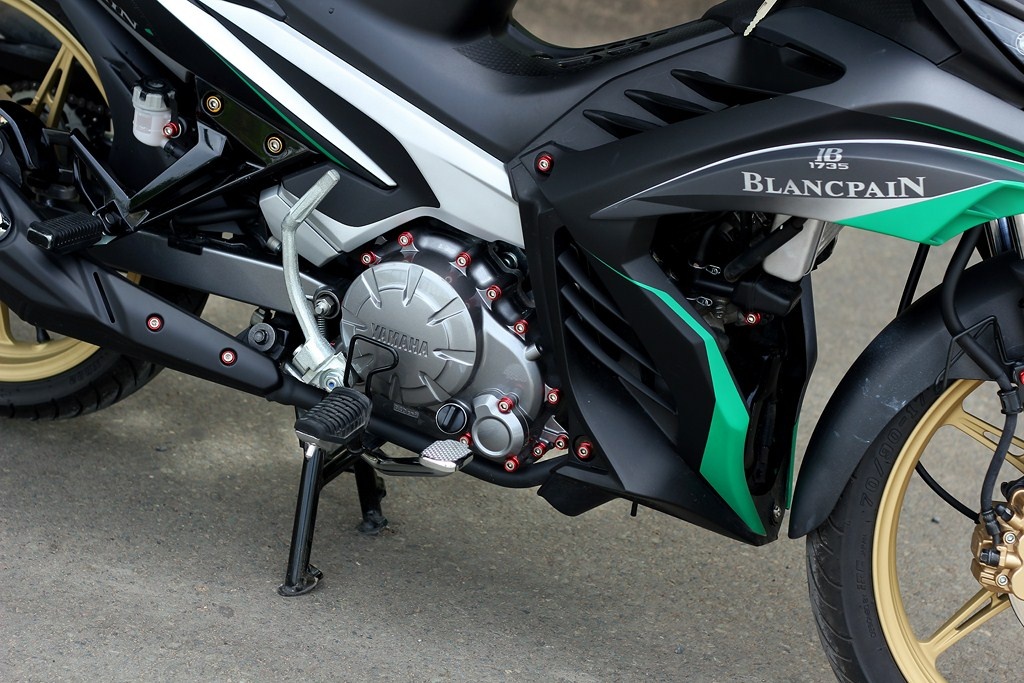 Ốc đĩa trước được thay toàn bộ bằng ốc titan xịn. Phần lốc máy và một số điểm nhấn trên dàn áo được thay bằng ốc chrome. |