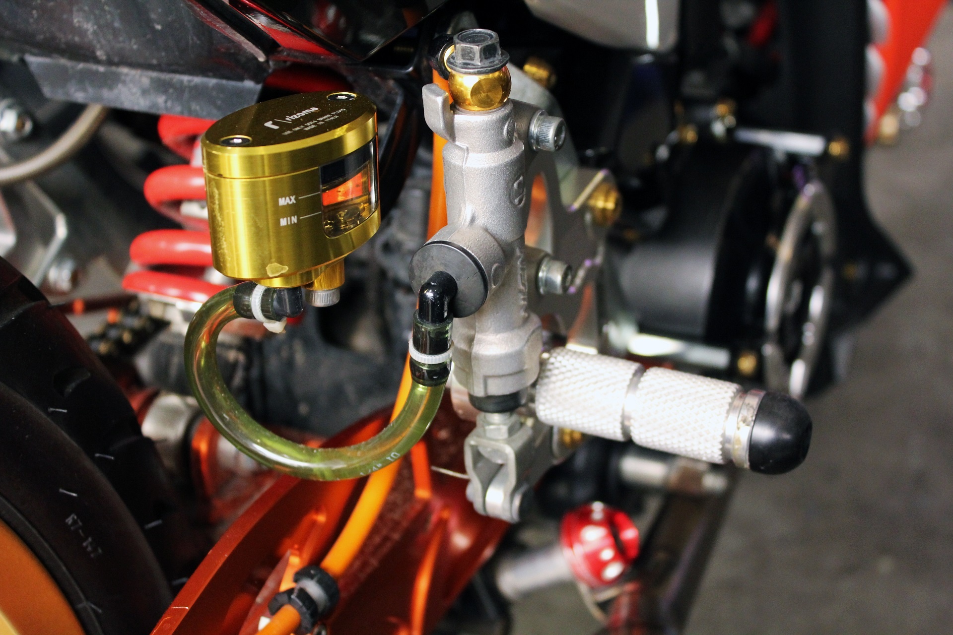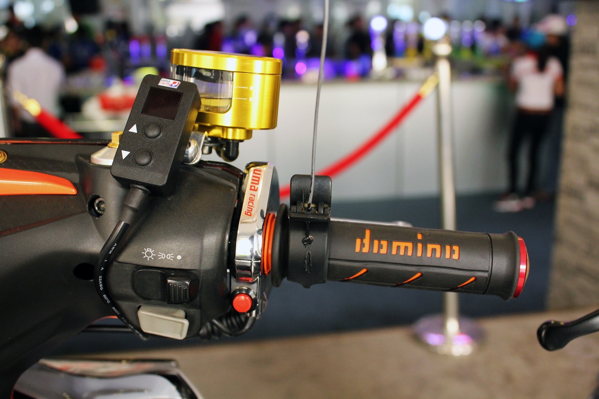 | Xe gắn tay thắng bình dầu Rizoma rời ở phía trước cùng tay côn Racing Boy. |