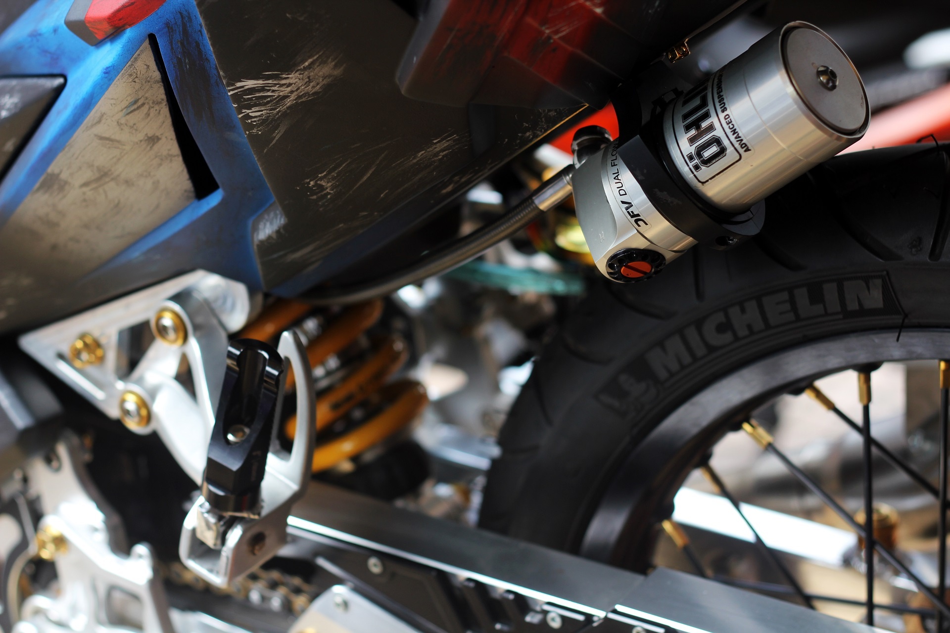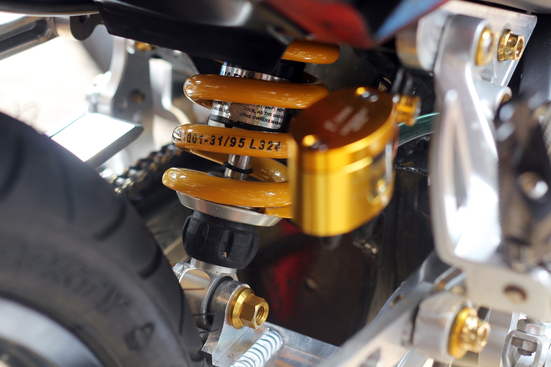 | Giảm chấn sau dạng mono shock cũng cùng thương hiệu Ohlins. |