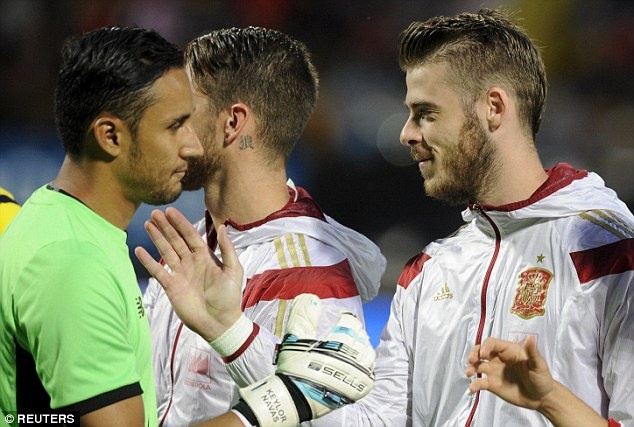 | De Gea bắt tay Keylor Navas, thủ môn số 2 của Real Madrid trước giờ bóng lăn. Cơ hội bắt chính của Navas ở Bernabeu càng ít đi nếu De Gea gia nhập "Kền kền trắng". |