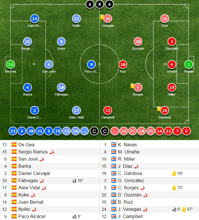 | Sau khi để Costa Rica vượt lên dẫn trước ở phút thứ 6, những nhà vô địch World Cup 2010 vùng lên dữ dội và ghi liền hai bàn thắng. Phút 30, Fabregas tận dụng rất tốt đường chuyền của Nolito để nâng tỷ số lên 2-1 cho Tây Ban Nha. |