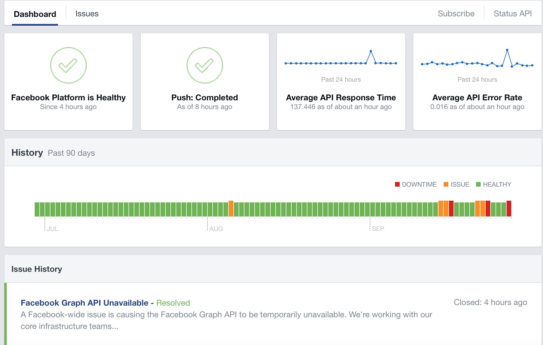 | Trang theo dõi sự cố Facebook cho các lập trình viên cho biết mạng xã hội này gặp trục trặc với Graph API. Sự cố đã được khắc phục sau hai giờ đồng hồ. |