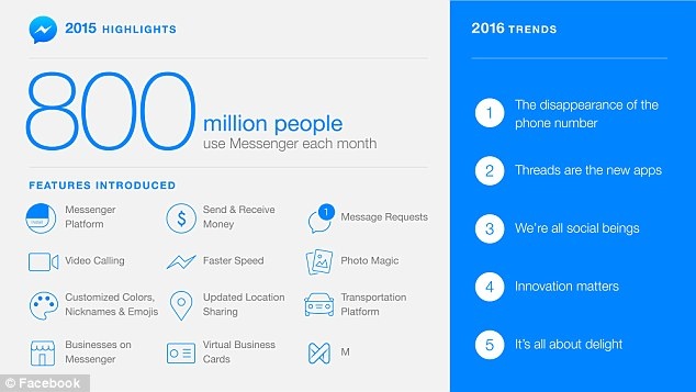 Bây giờ là thời đại bùng nổ công nghệ toàn cầu và Facebook muốn dựa vào đó để loại bỏ hoàn toàn sự tồn tại của số điện thoại. Đó là điều mà giám đốc phụ trách mảng Messenger của Facebook tin tưởng. Ông cũng cho biết trong năm 2015, mảng tin nhắn của hãng đã đạt cột mốc 800 triệu người sử dụng.