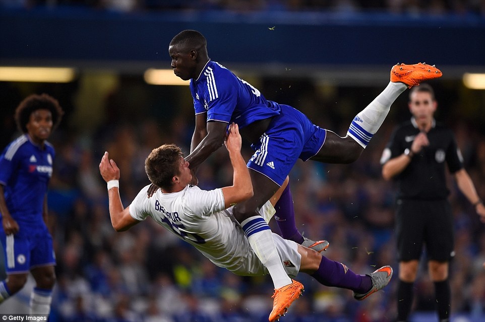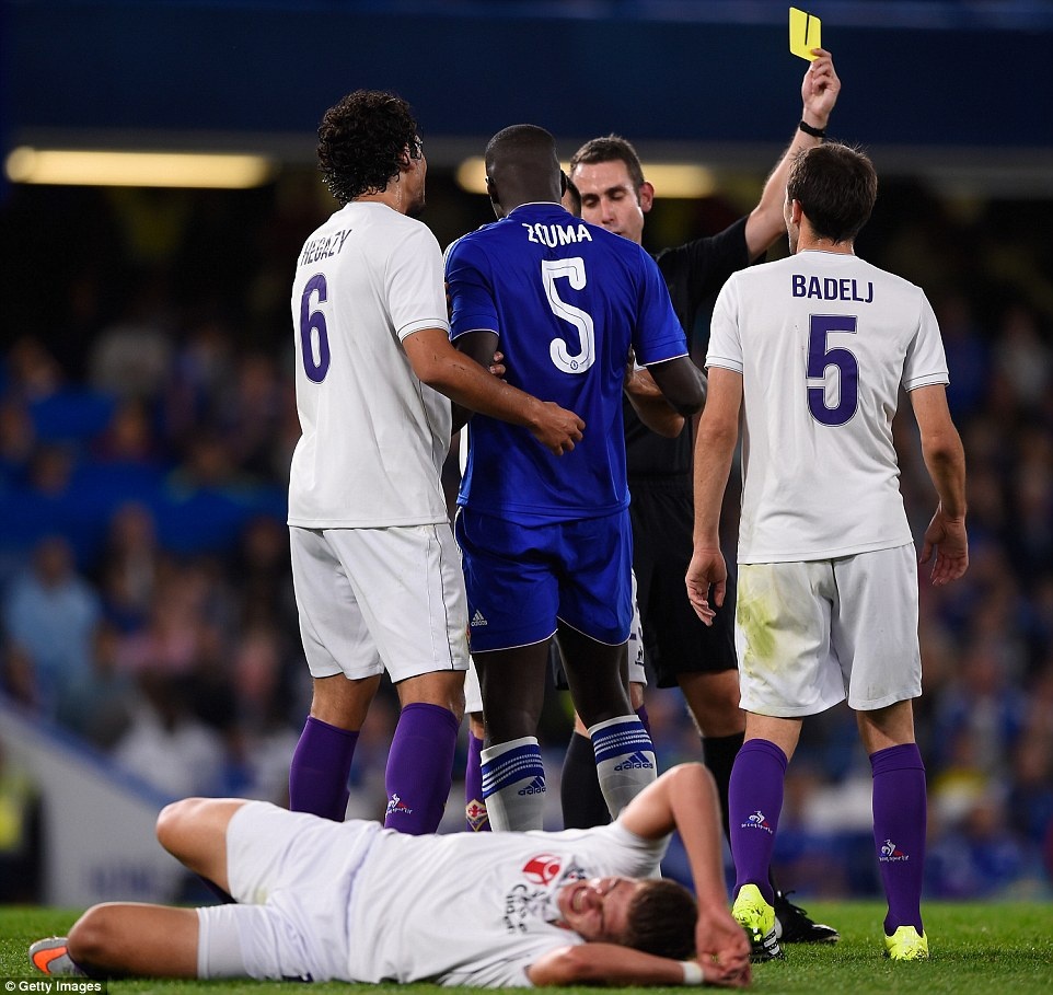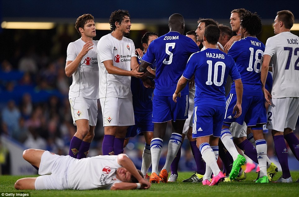 | Các cầu thủ hai đội va chạm sau pha vào bóng của Zouma. Nhưng trước sự can ngăn kịp thời của Hazard, Fabregas và một số cầu thủ Fiorentina, không có chuyện đáng tiếc xảy ra.