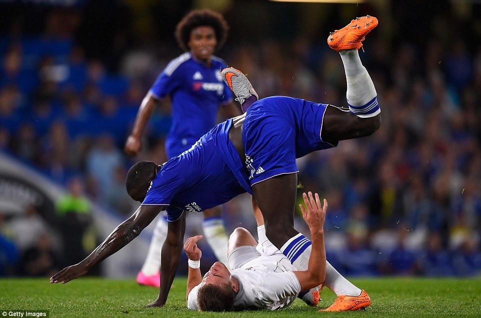 | Ricardo Bagadur lăn lộn dưới sân sau pha vào bóng nguy hiểm của hậu vệ Chelsea. |