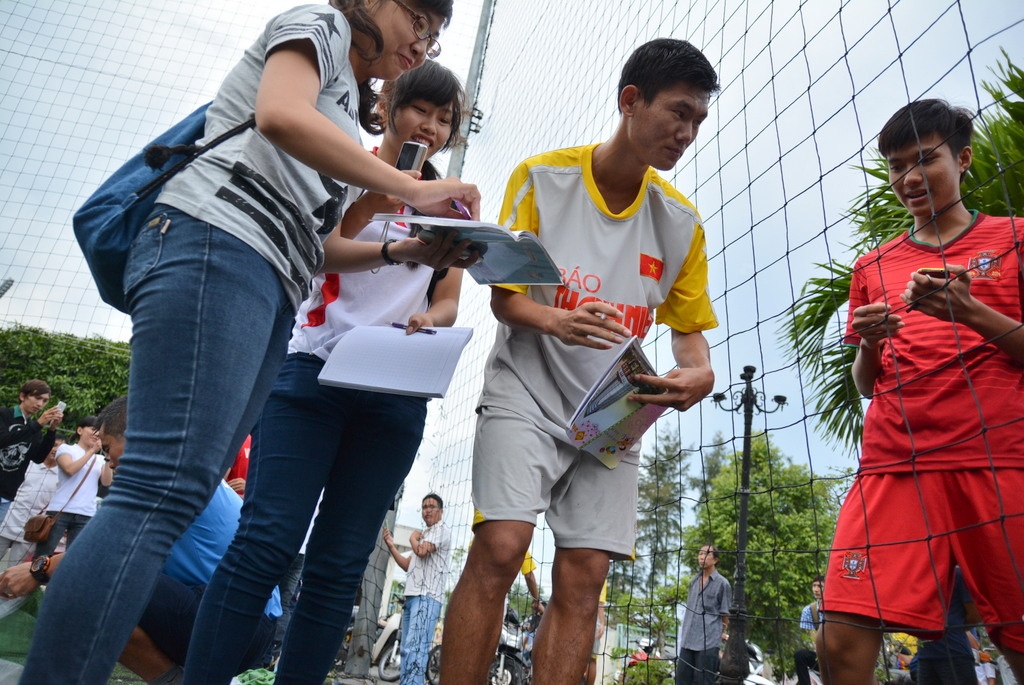 | Dù chỉ là buổi tập nhưng có rất đông fan đã đến xem các cầu thủ rồi xin chữ ký. Tuyển thủ Phi Sơn là một trong những người được săn đón nhất. |