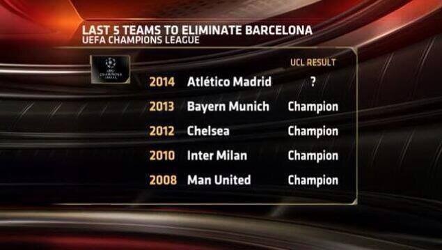 | 5 đội bóng gần nhất loại Barca khỏi Champions League sau đó đều lên ngôi vô địch. |