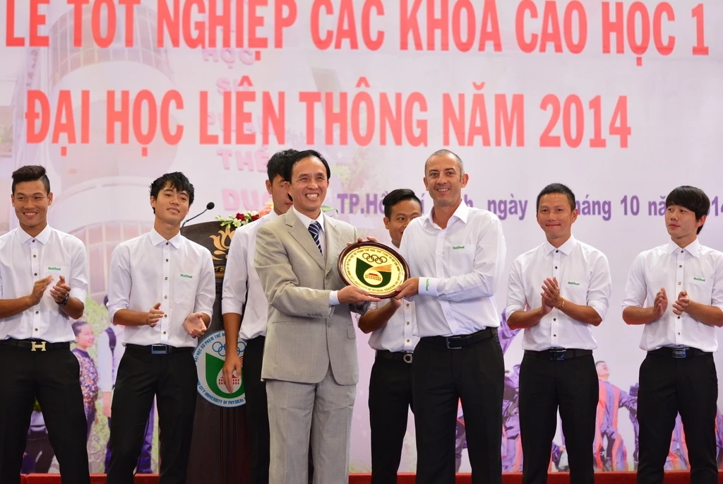 | HLV Graechen thay mặt đội U19 tặng quà cho ông Huỳnh Trọng Khải, hiệu trưởng trường Đại học sư phạm TDTT TP. HCM. Thay mặt nhà trường, ông Khải cũng tặng kỷ niệm chương cho đội. |