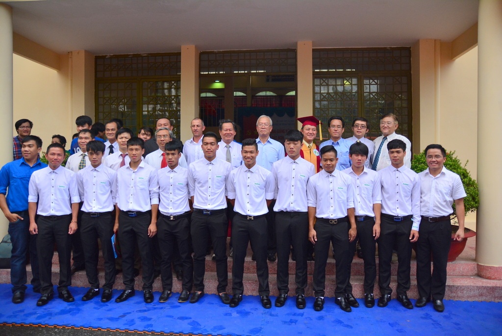 | Công Phượng cùng các tân sinh viên ra mắt ban giám hiệu nhà trường. Họ sẽ học tại đây theo chương trình liên kết 4 năm. Sau khi ra trường họ có thể trở thành giáo viên thể chất hoặc HLV bóng đá với điều kiện học thêm bằng cấp bổ sung. |