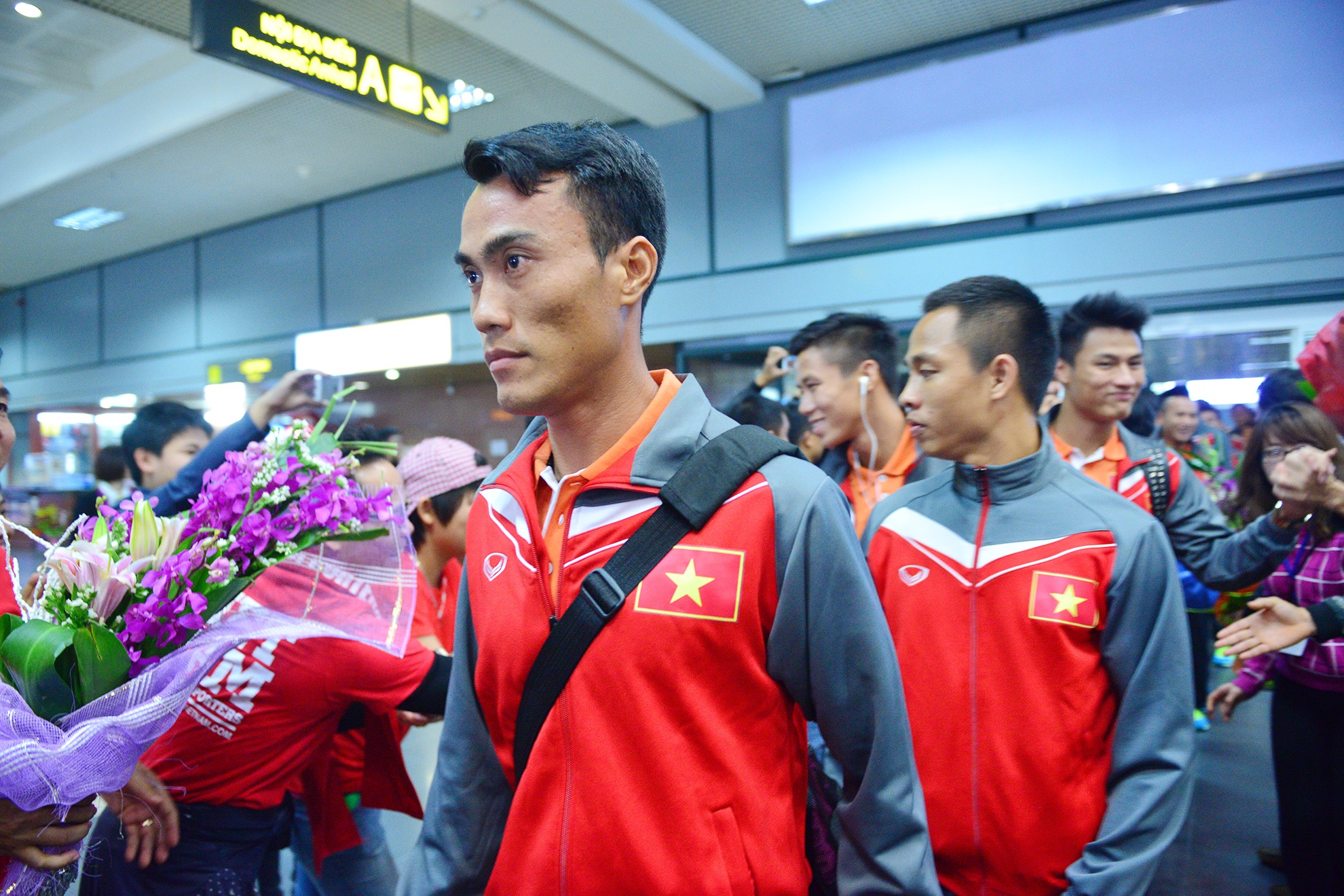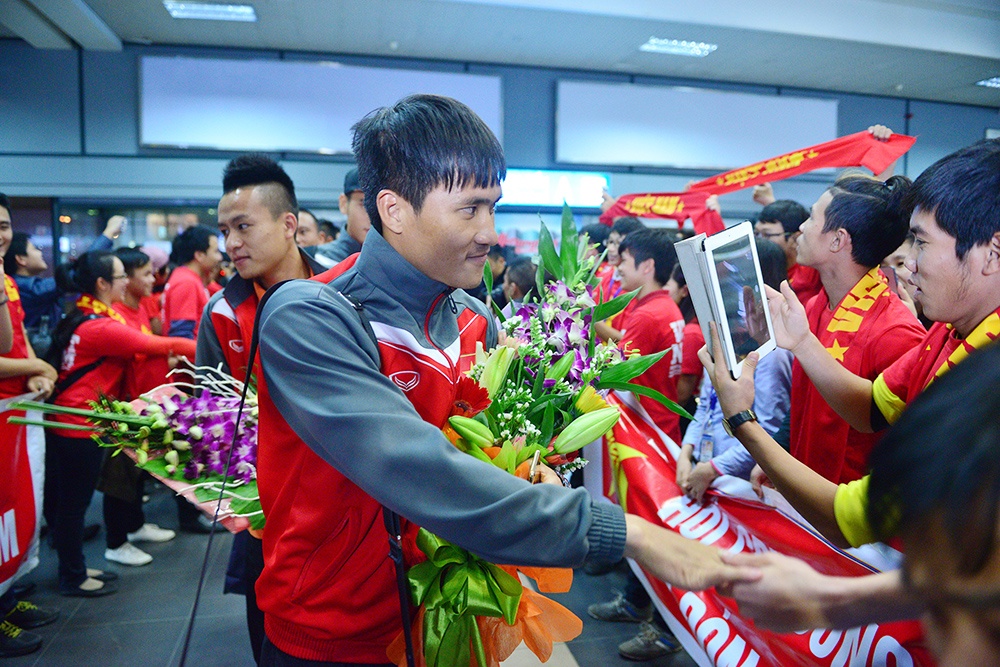 | Trước đó, từ 16h, nhóm cổ động viên VFS (cổ động viên bóng đá Việt Nam) đã đến sân bay đón các cầu thủ với băng rôn, cờ và hoa. |