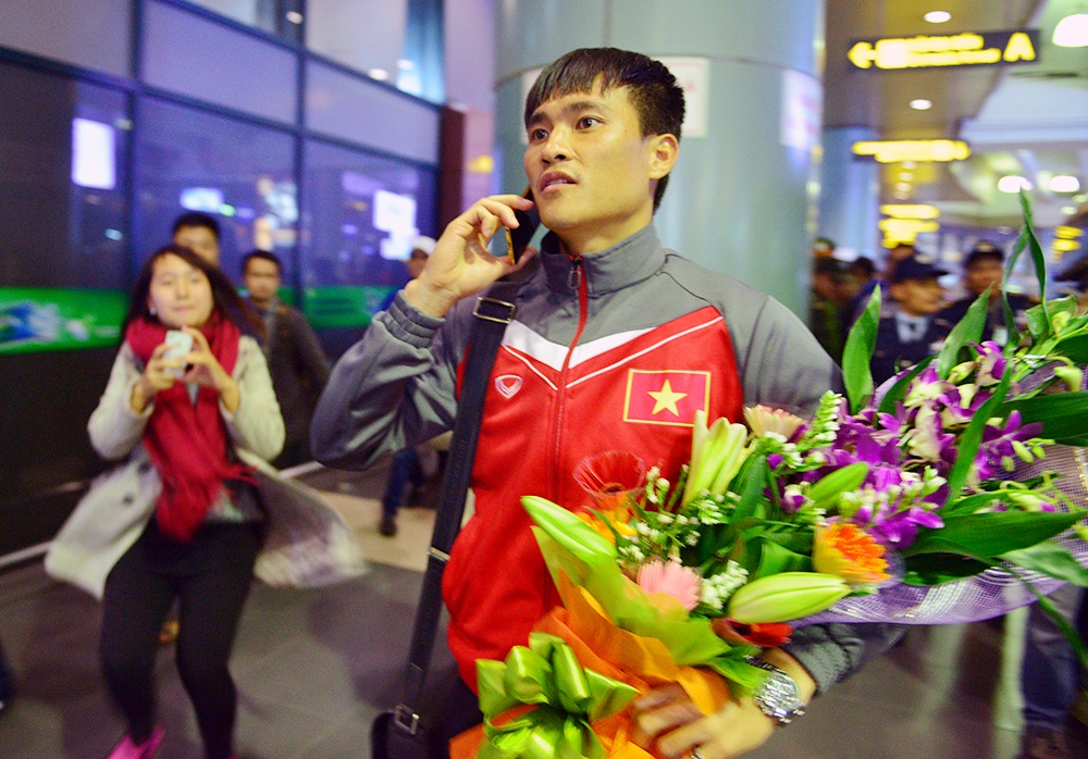 | Lãnh đạo Liên đoàn bóng đá Việt Nam trao hoa ngay tại sảnh A sân bay. Toàn đội di chuyển chừng 10 phút rồi lên xe về khách sạn. |