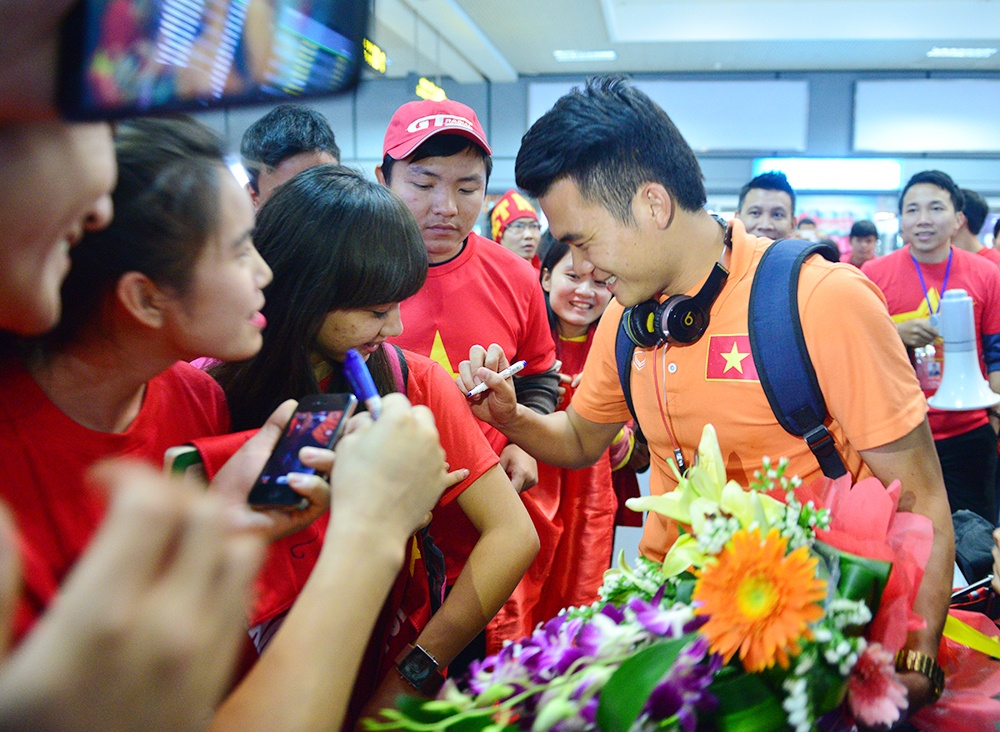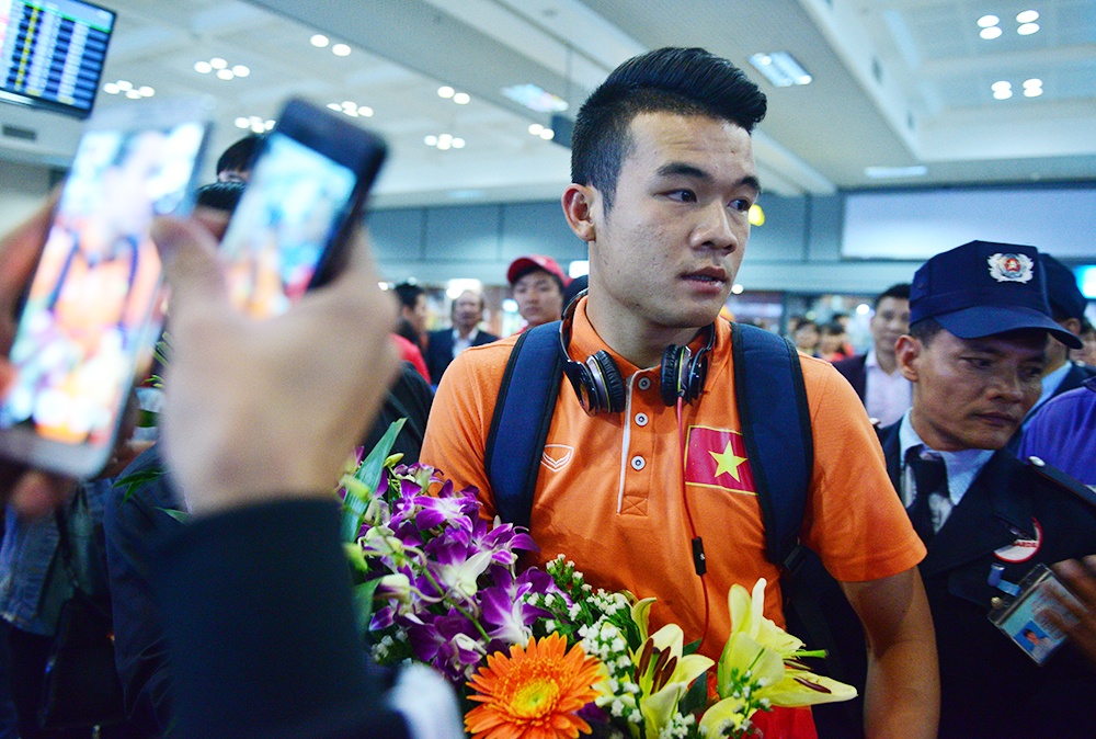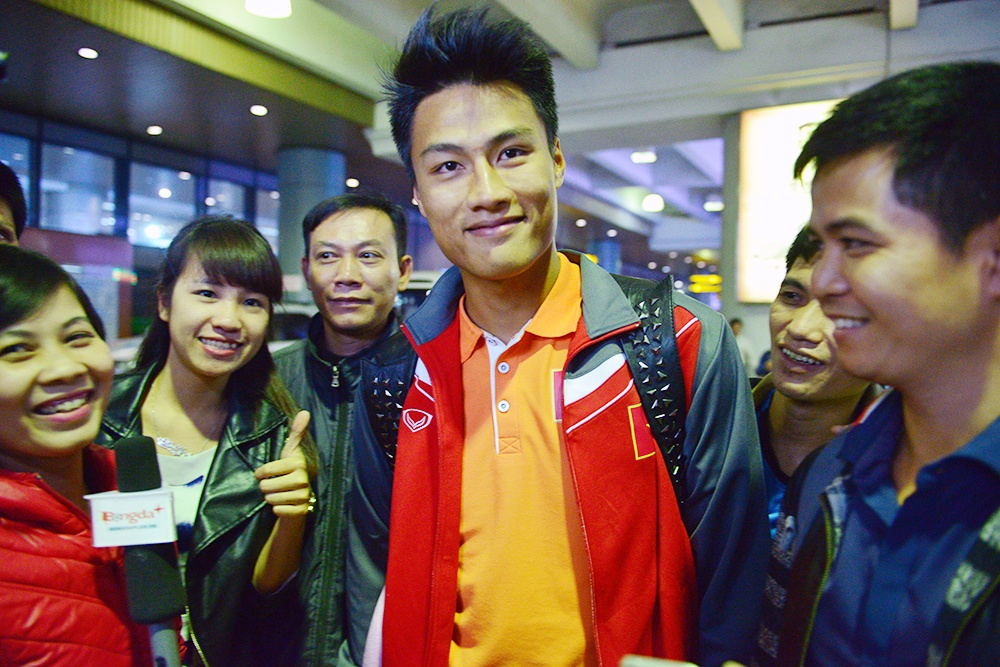 | Tiền vệ nhỏ con Thành Lương bất ngờ trước sự chào đón của người hâm mộ. |