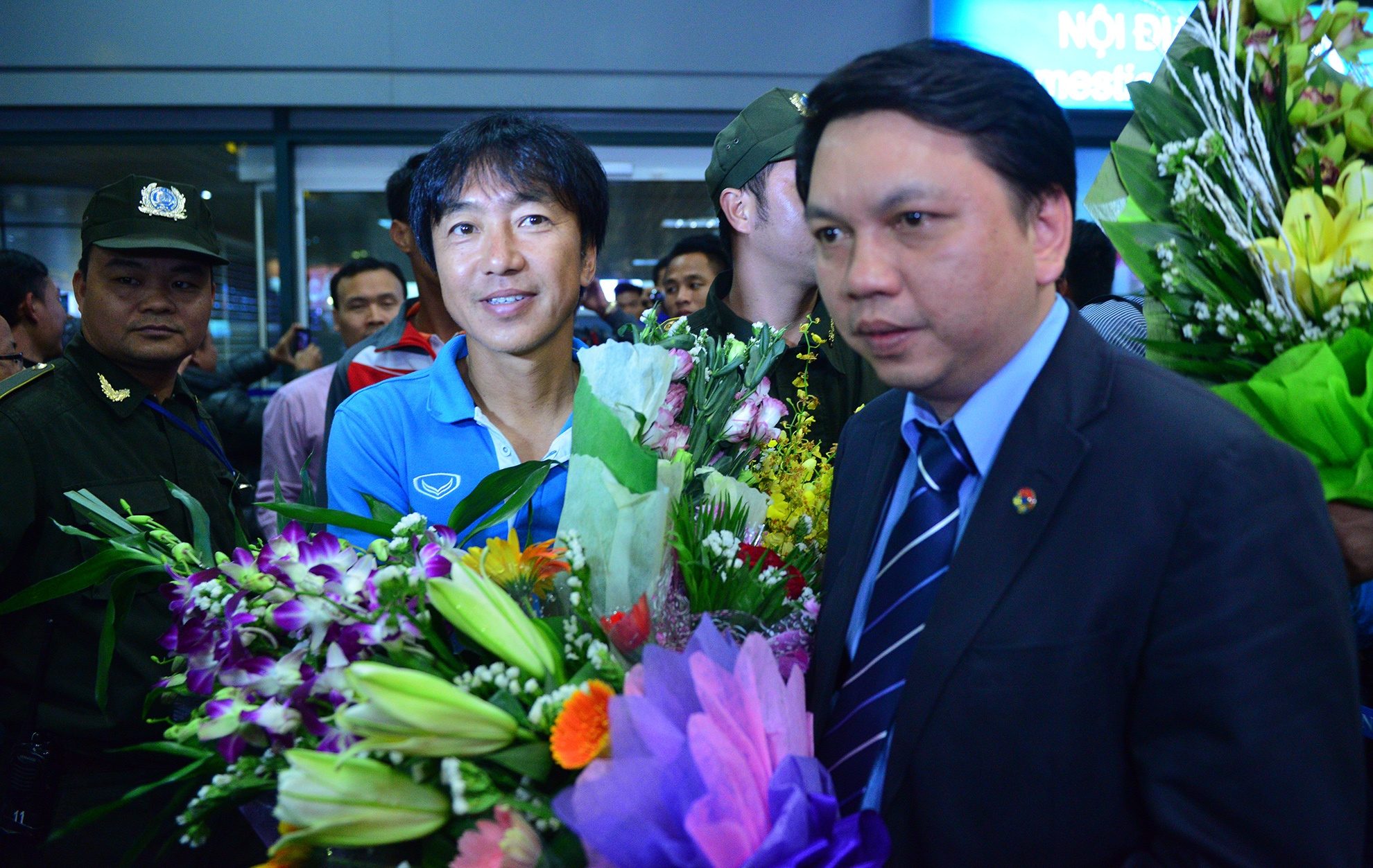 | Đúng 18h30, các cầu thủ xuống sân bay, HLV trưởng Miura dẫn đầu đoàn mỉm cười chào người hâm mộ. |