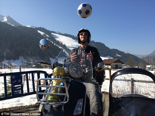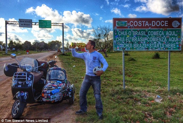 | Anh Chris Hallett thực hiện hành trình dài 24.000 km tới Brazil cổ vũ World Cup bằng xe Vespar sidecar. |