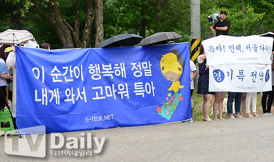 Chính vì lẽ đó, hàng trăm fan bất chấp trời mưa, kiên nhẫn giăng banner và đứng đợi Lee Teuk bên ngoài doanh trại từ sớm đã phải thất vọng đứng nhìn chiếc xe chở thần tượng đi qua.