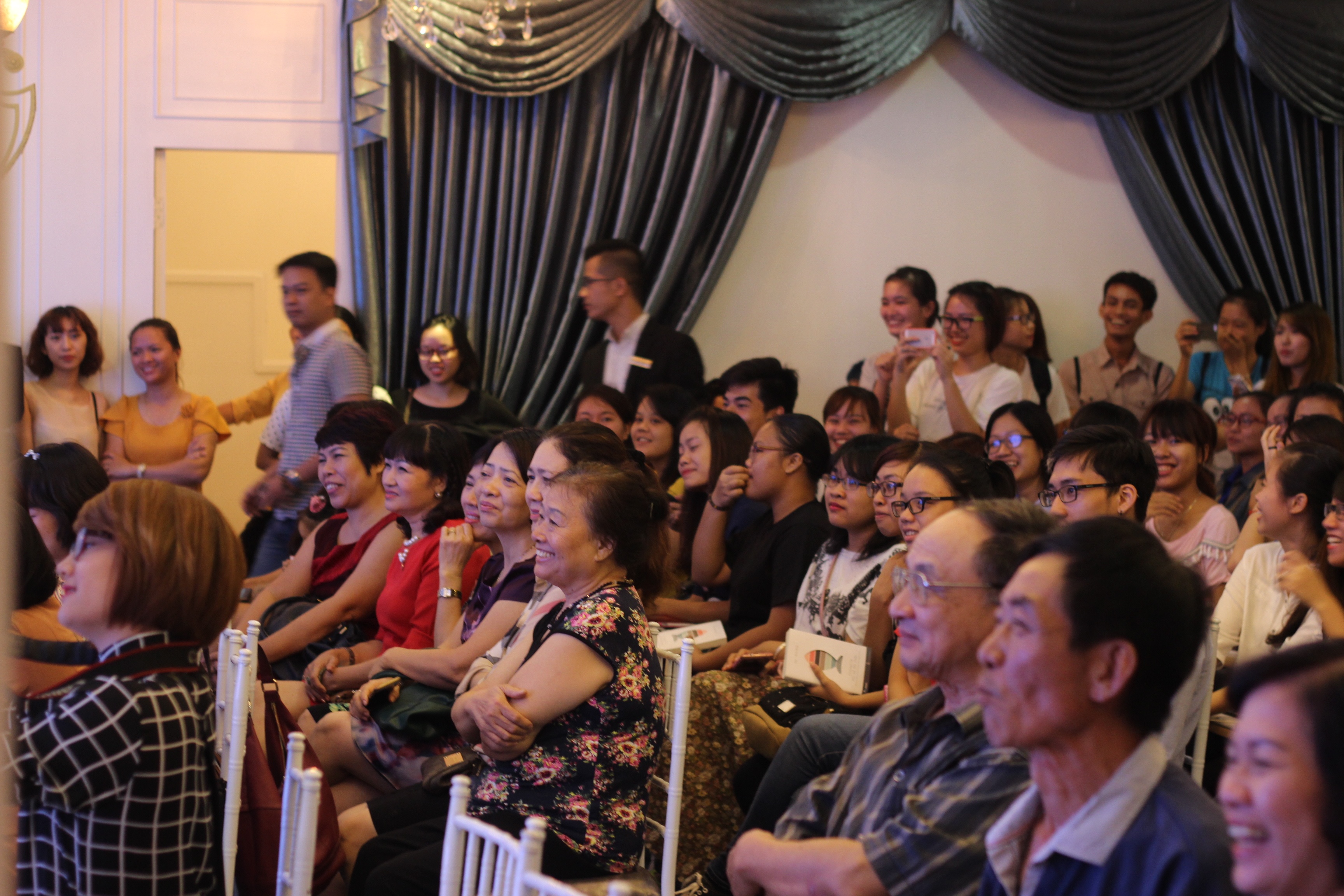 | Dù trời Hà Nội mưa tầm tã nhưng người hâm mộ vẫn tới chật kín khán phòng và háo hức khi là những người đầu tiên cầm trên tay cuốn sách. Bên cạnh đó, buổi ra mắt còn có sự góp mặt của những người thân trong gia đình Gào và Minh Nhật. |