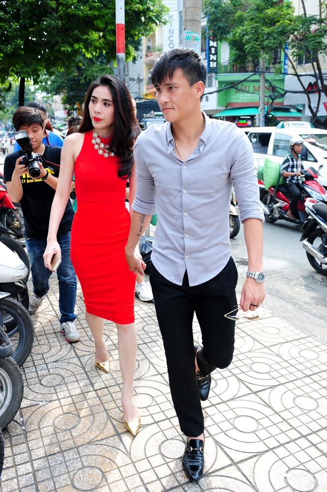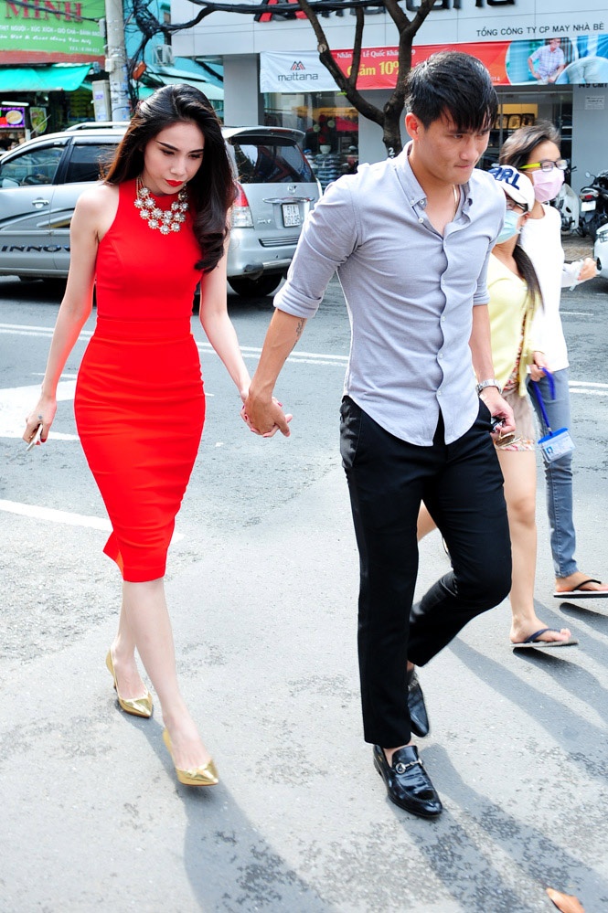 | Công Vinh lái xe riêng đưa Thủy Tiên đến buổi gặp gỡ. Sau khi xuống xe, anh dắt tay vợ trên phố thu hút sự chú ý. Trong khi Thủy Tiên mặc nổi bật, sang trọng thì ông xã của cô lại khá giản dị. |