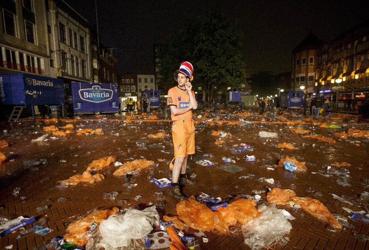 | Một nam cổ động viên thờ thẫn, lạc lõng đứng giữa "bãi chiến trường" toàn rác do người hâm mộ Hà Lan bỏ lại. |