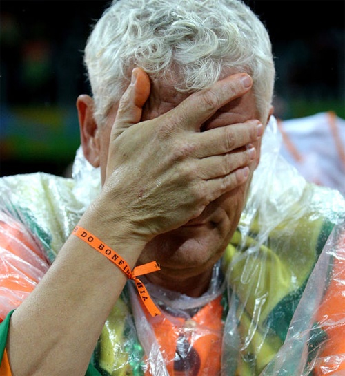 | Một cổ động viên cao tuổi ôm mặt che đi nỗi thất vọng trước thất bại của "cơn lốc màu da cam". |