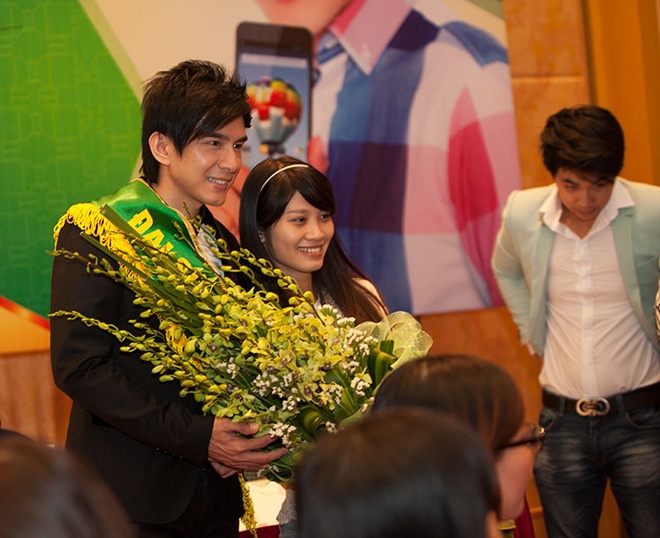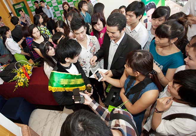 Trong sự kiện sáng 8/10, các fan của anh Bo lại một lần nữa chứng minh sự cuồng nhiệt của mình khi hàng loạt người hâm mộ vây chặt Đan Trường để chụp ảnh, xin chữ ký và hỏi han những thắc mắc về thần tượng.
