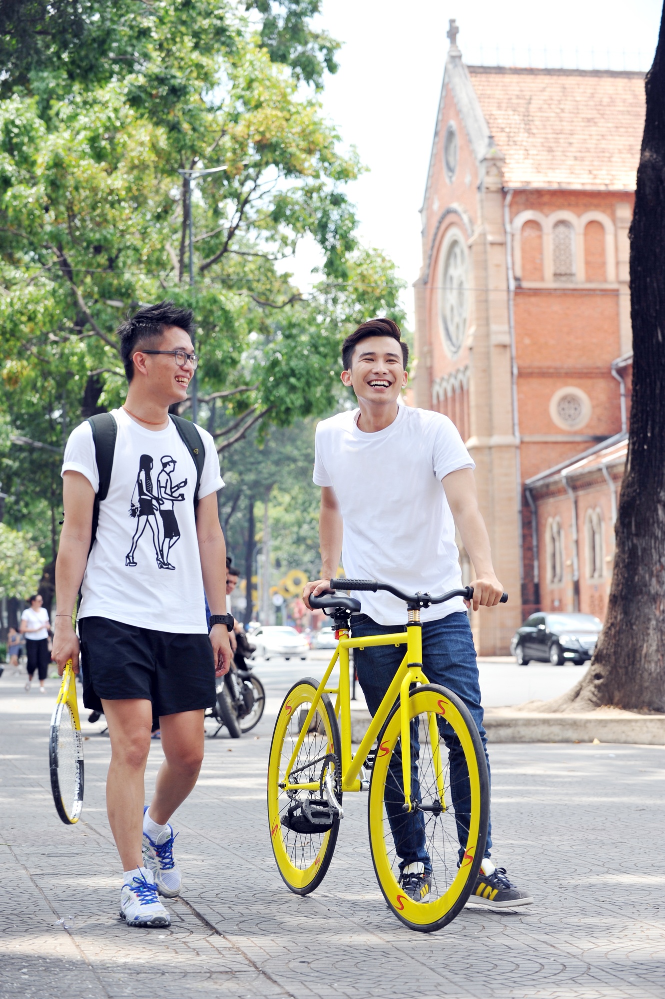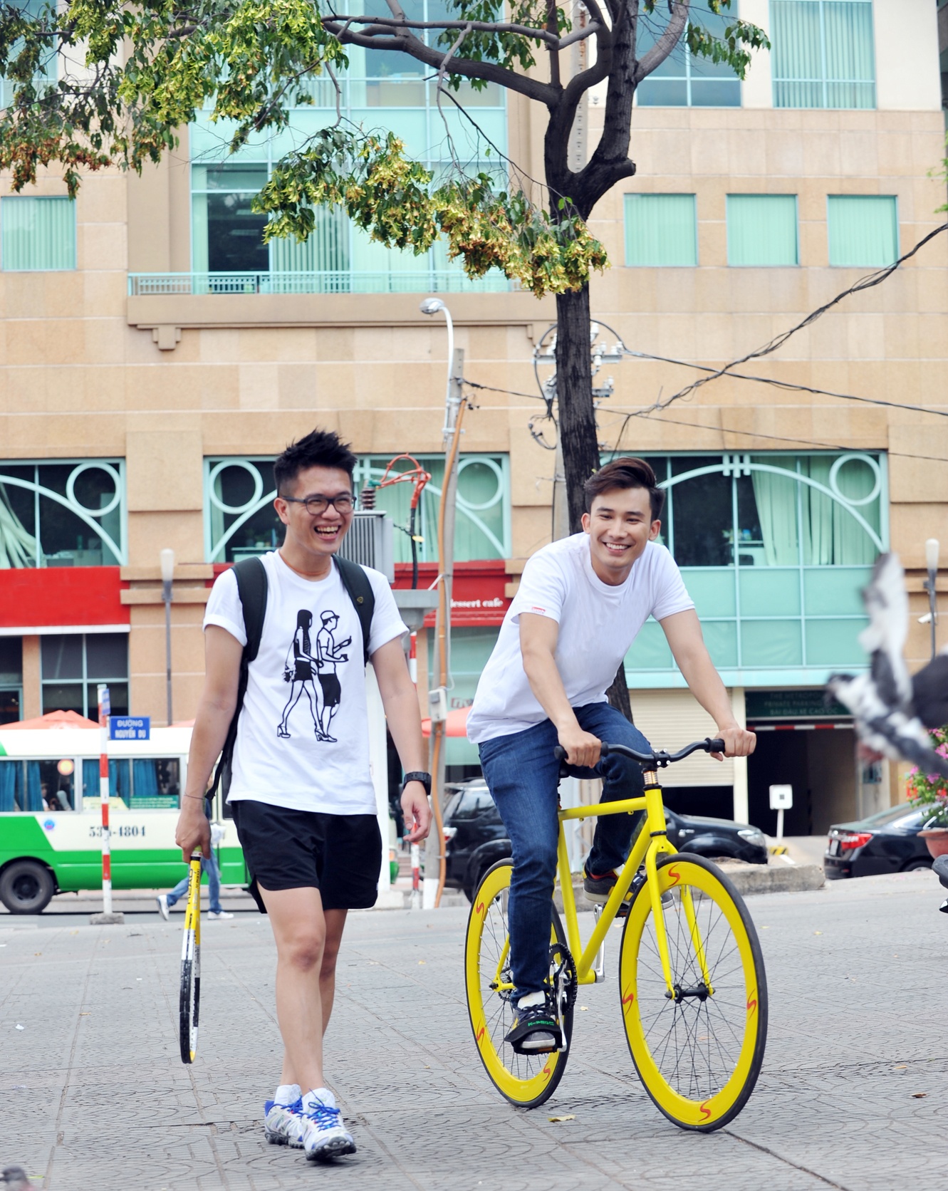 | Còn Chí Thiện thì cười tít mắt tạo dáng với chiếc fixie của… “người ta”. Anh chàng còn thích đến độ leo lên xe chạy thử trước luôn. Chí Thiện chia sẻ đạp xe fixie vui hơn đạp xe trong phòng tập nhiều. |
