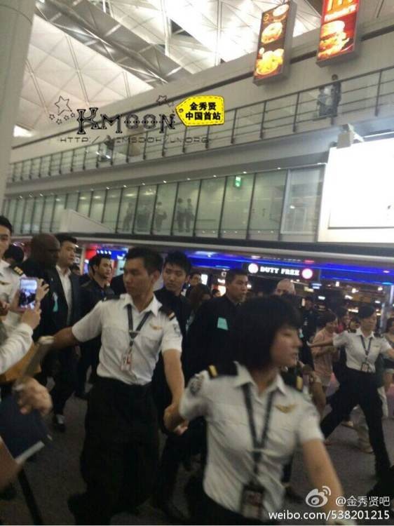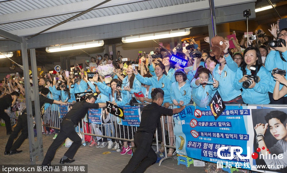 Lực lượng bảo vệ vất vả trước sự hứng khởi của hơn 500 người hâm mộ Kim Soo Hyun. Fan club của chàng tài tử xứ Hàn ở Hong Kong tổ chức rất quy củ với áo đồng phục, băng rôn, biểu ngữ, đèn phát sáng,...