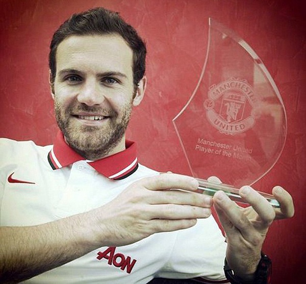 | Juan Mata vui mừng với giải thưởng cầu thủ xuất sắc nhất tháng 3 do fan M.U bình chọn. Ảnh: Instagram. |