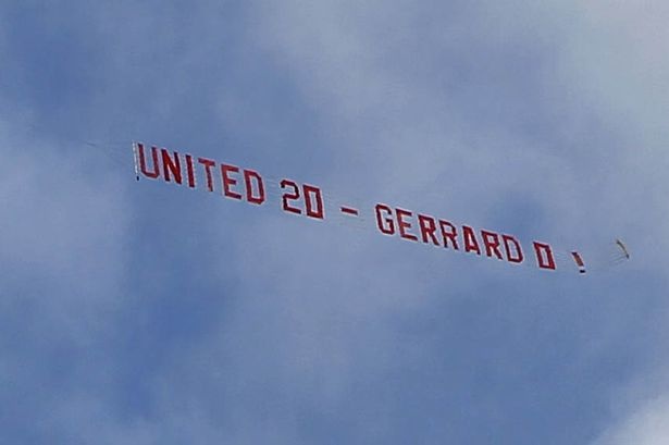 Ngay khi Liverpool bước vào cuộc tiếp đón Newcastle ở loạt trận cuối cùng Ngoại hạng Anh 2013/14, một chiếc phi cơ đem theo biểu ngữ “United 20 - Gerrard 0” bay lượn trên sân Anfield. Đây là hành động trả đũa mà fan Quỷ đỏ dùng để chế nhạo lại những gì mà người hâm mộ The Kop từng làm trước đây.