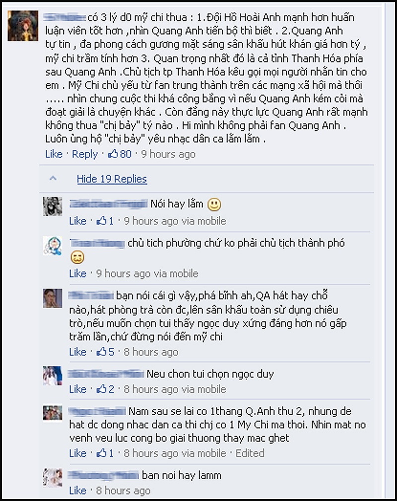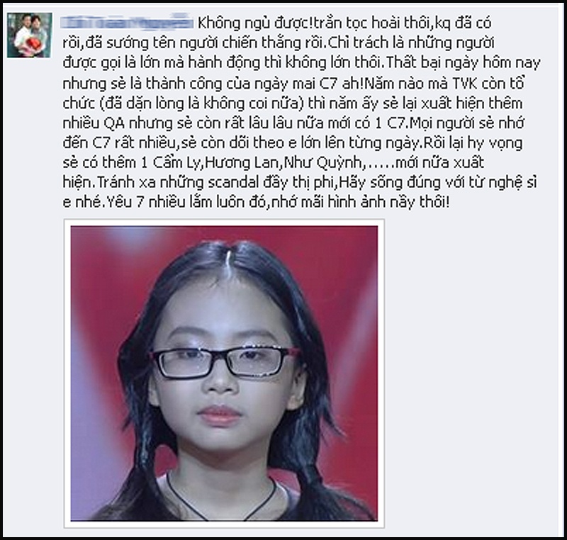 Admin của diễn đàn này cũng phân tích khá chi tiết rằng: "Trong giây phút này nếu khuyên các bạn đừng buồn, đừng tức giận, đừng chửi mắng là điều ngu xuẩn. Nhưng ad mong các bạn cũng đừng nên quá cay cú với "người thắng cuộc" mà có những lời lẽ không hay, làm thế mọi người sẽ chỉ cho rằng chúng ta đang ghanh ghét, ghanh tỵ vì chúng ta là người thua cuộc. Nhưng mà ad buồn quá, nếu không muốn nói là thất vọng vô cùng, lúc kết quả xướng lên ad gần như suy sụp. Dù sao thì cũng không thay đổi được gì phải không cả nhà? Vậy nên có lẽ chúng ta nên dành cho Cô bé dân ca một trái tim yêu thương đi nhỉ?".