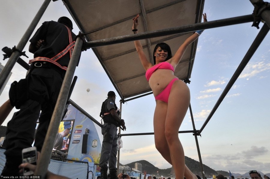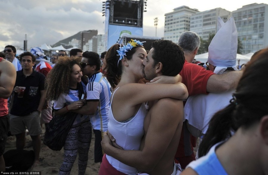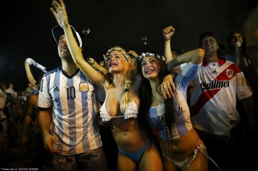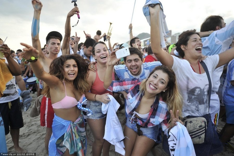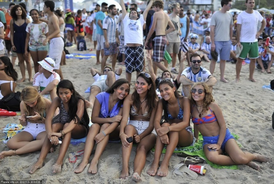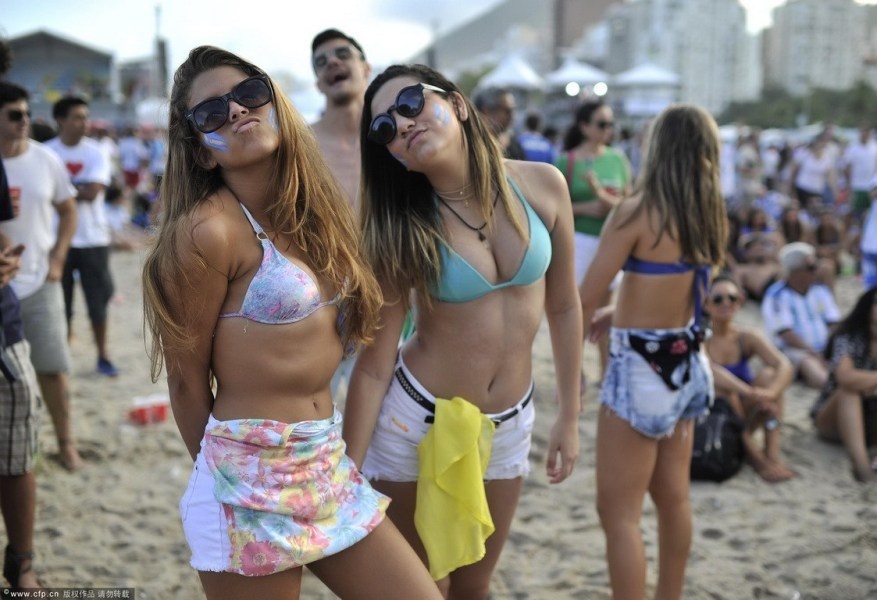 | Không khí trên bãi biển nơi hàng trăm cổ động viên xứ Tango tụ tập theo dõi trận đấu trực tiếp của Argentina gặp Đức trong khuôn khổ bán kết World Cup thậm chí nóng không kém gì trên khán đài sân vận động Arena de Sao Paulo. Đặc biệt, sự xuất hiện của nhiều nữ cổ động viên bốc lửa khuấy động thêm bầu không khí thêm phần cuồng nhiệt. |