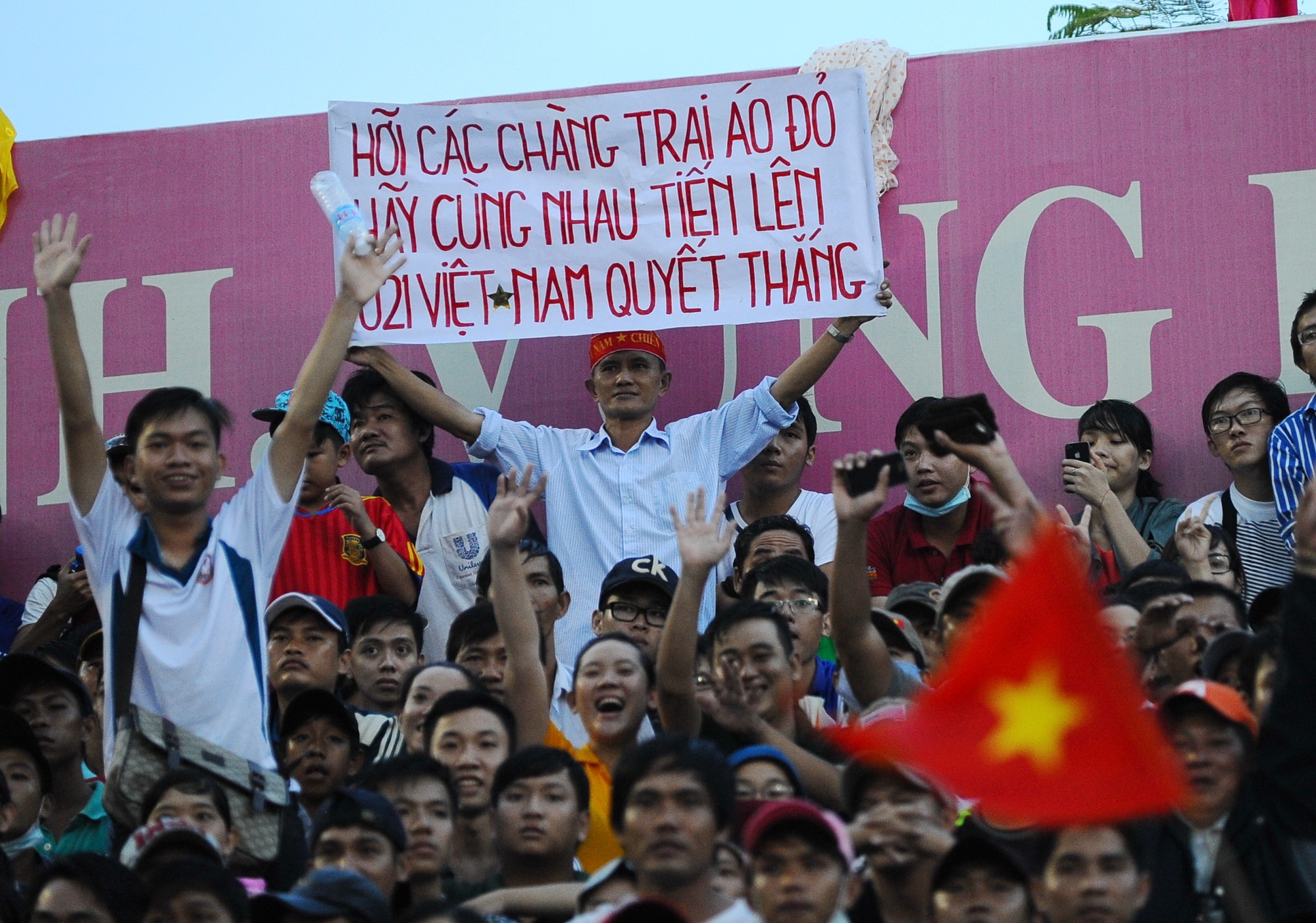 | Tấm băng rôn ý nghĩa của một CĐV lớn tuổi để động viên tinh thần các cầu thủ U21 Việt Nam. |
