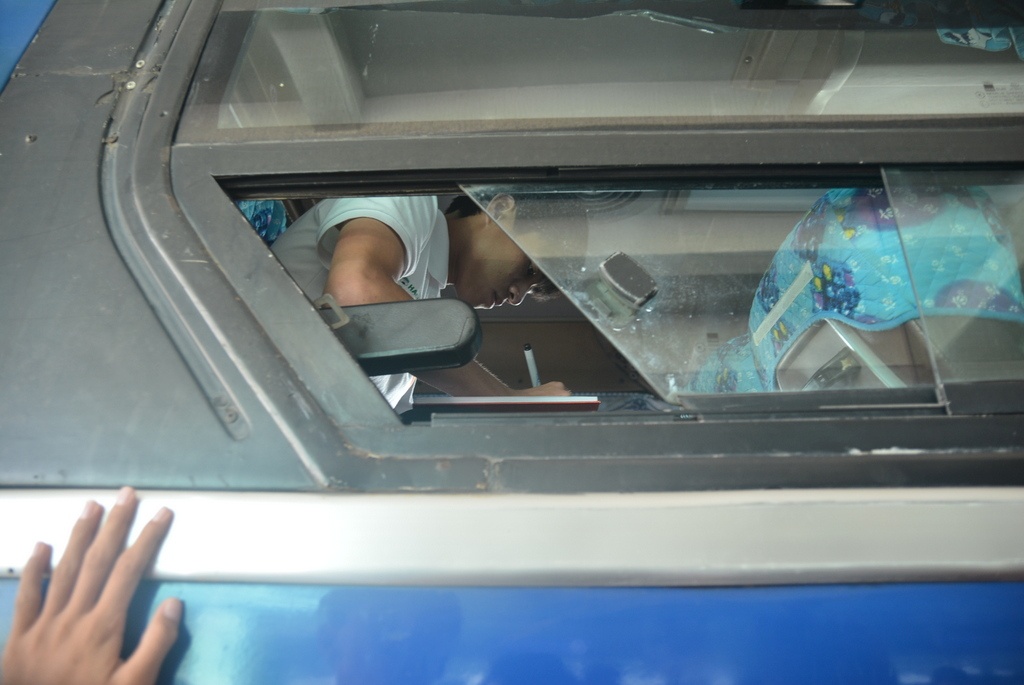 | Ngồi ở hàng ghế cuối cùng của xe, Thanh Hậu cặm cụi ký tặng fan. |