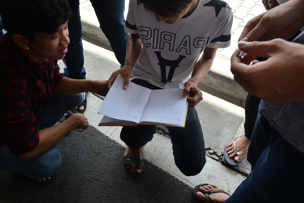 | Một fan nam hào hứng khoe chữ ký xin được của Thanh Hậu và các cầu thủ U19 HAGL với chúng bạn. |