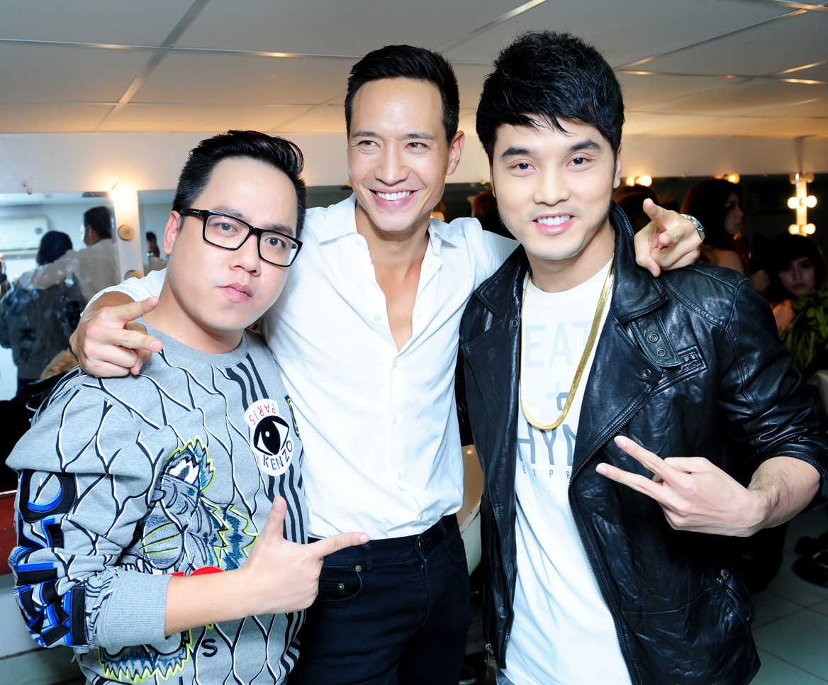 | Kim Lý đọ vẻ điển trai cùng nam ca sĩ Thà rằng như thế. Anh và Ưng Hoàng Phúc chụp hình lưu niệm cùng MC Tùng Leo - đồng nghiệp thân thiết của Trương Ngọc Ánh. |