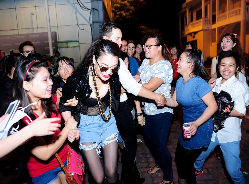 | Sau đêm nhạc, khán giả túc trực tại khu vực cửa sau để được gặp và chạm người cặp đôi Kim Lý, Trương Ngọc Ánh. Nam diễn viên điển trai bị các fan nữ kéo người lại, ôm chặt khiến anh khó xử. |