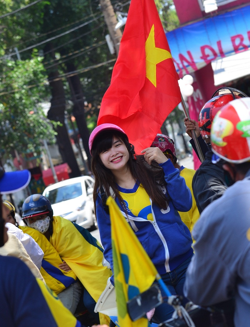 | Trong sân, các fan nữ tự tin khoe sắc. Nụ cười của những cô gái Sông Lam xinh xắn khiến cái nắng gắt trở nên dễ chịu hơn với những chàng trai xứ Nghệ. |