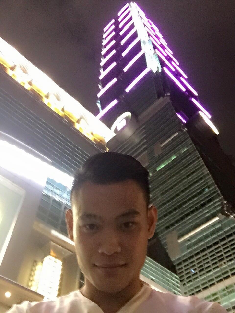 | Hậu vệ Nguyễn Minh Tùng chụp ảnh lưu niệm cùng tòa tháp cao 101 tầng ở Đài Loan. |