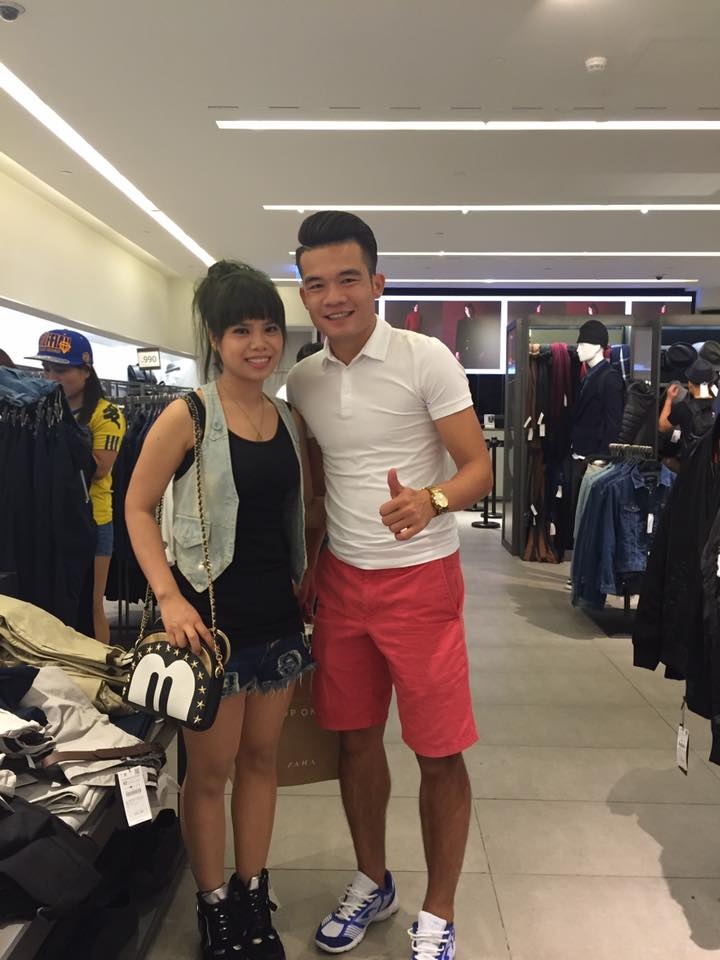| Trung vệ Đinh Tiến Thành chụp ảnh cùng fan nữ đồng hương Hải Phòng. |