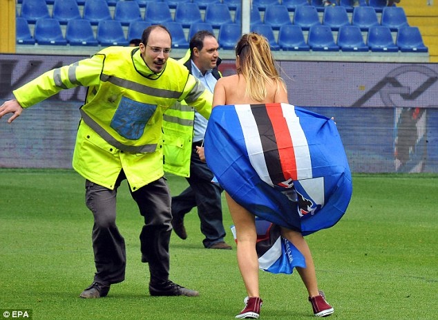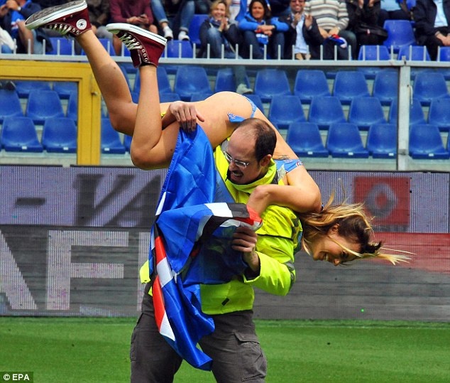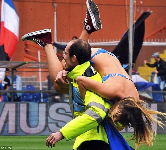 | Fan nữ không ngại ngần lột bỏ xiêm y, mặc đúng một bộ bikini màu xanh, tay cầm cờ Sampdoria phấn khích chạy nhảy trên sân cỏ. Sự xuất hiện đột ngột của cô gái khiến đông đảo khán giả trên sân vừa bất ngờ vừa phấn khích, trong khi đó, lực lượng an ninh và ban huấn luyện lại khá bối rối. |