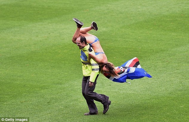 | Một nhân viên an ninh trên sân phải chơi trò "mèo vờn chuột" và khá khó khăn mới có thể bắt được cô gái. |