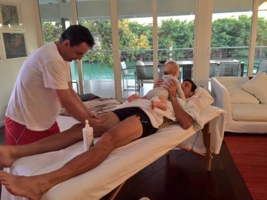 | Tay vợt Novak Djokovic ăn mừng chiến thắng bằng cách vừa đùa nghịch với con trai Stefan, vừa nằm dài cho nhân viên mát-xa. |