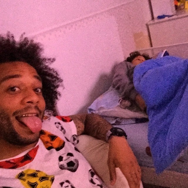 Marcelo lè lưỡi tinh nghịch chụp hình kèm theo lời chúc "Chúc ngủ ngon" gửi tới fan Real.