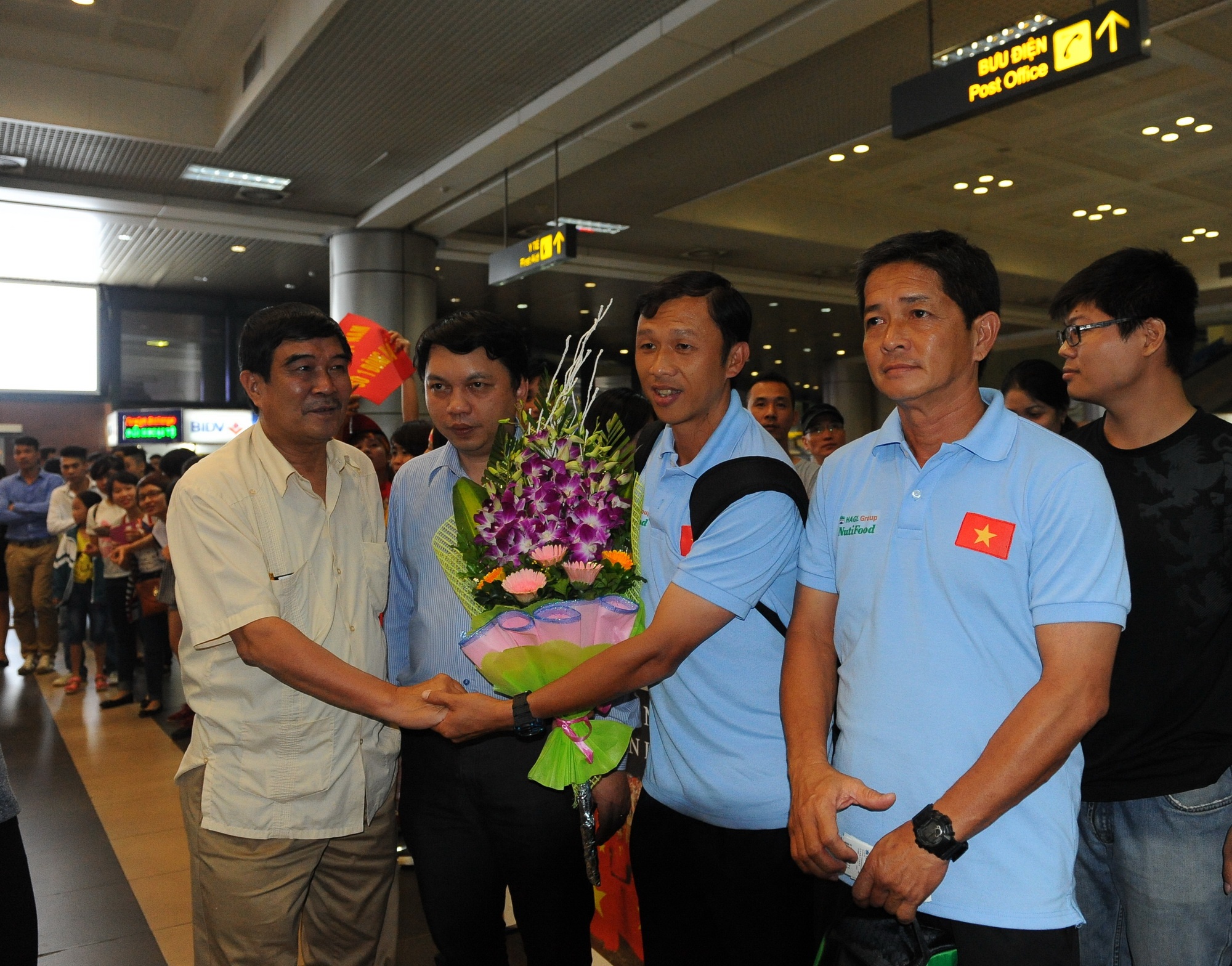 | Có mặt tại sân bay Nội Bài đón các cầu thủ U19 Việt Nam có Phó Chủ tịch LĐBĐ Việt Nam Nguyễn Xuân Gụ và Tổng thư ký VFF Lê Hoài Anh. |