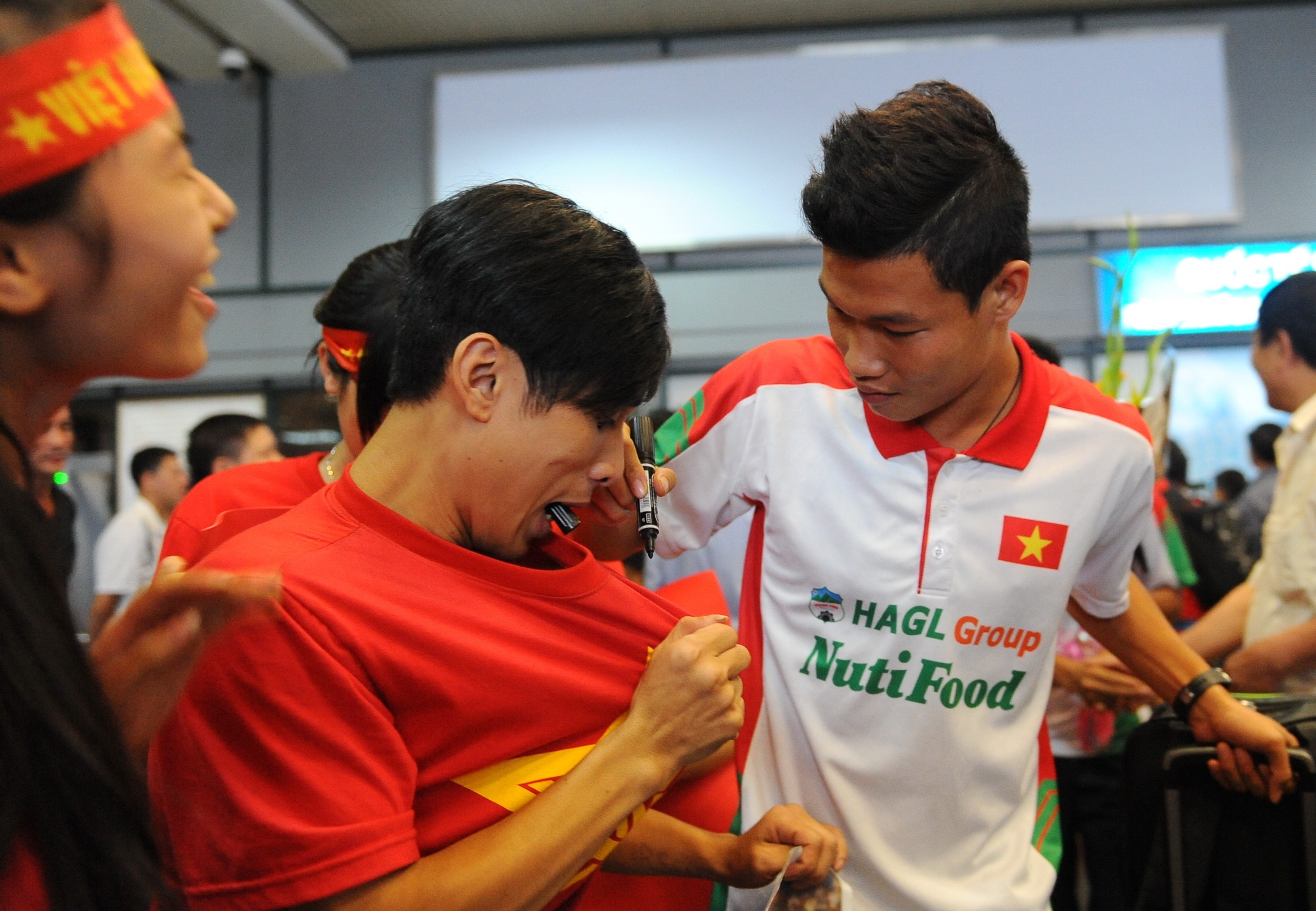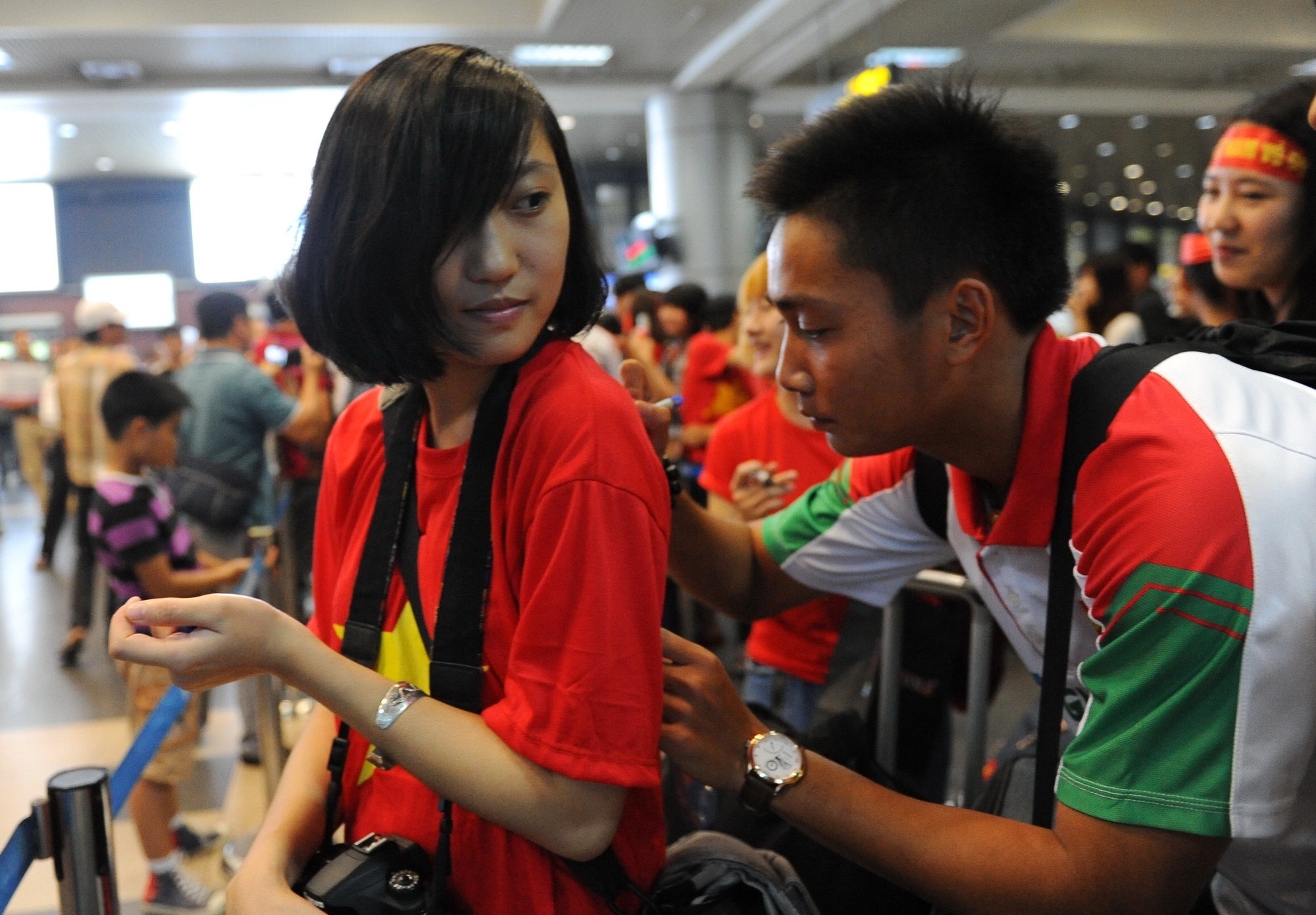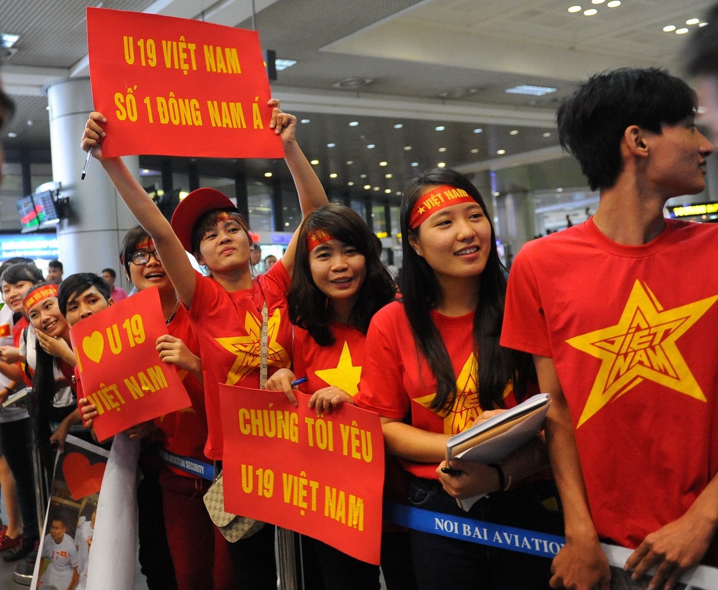 | Khá nhiều người hâm mộ đã không ngại đêm khuya tới sảnh quốc tế đón các cầu thủ U19 Việt Nam. Bạn Minh Nguyệt (ĐH Dược HN) phải tới 0h30 ngày 16/10 mới về tới phòng trọ của mình. Nhưng cô sinh viên năm thứ 2 hạnh phúc khi được tận mắt gặp và xin chữ ký các cầu thủ U19 Việt Nam. |