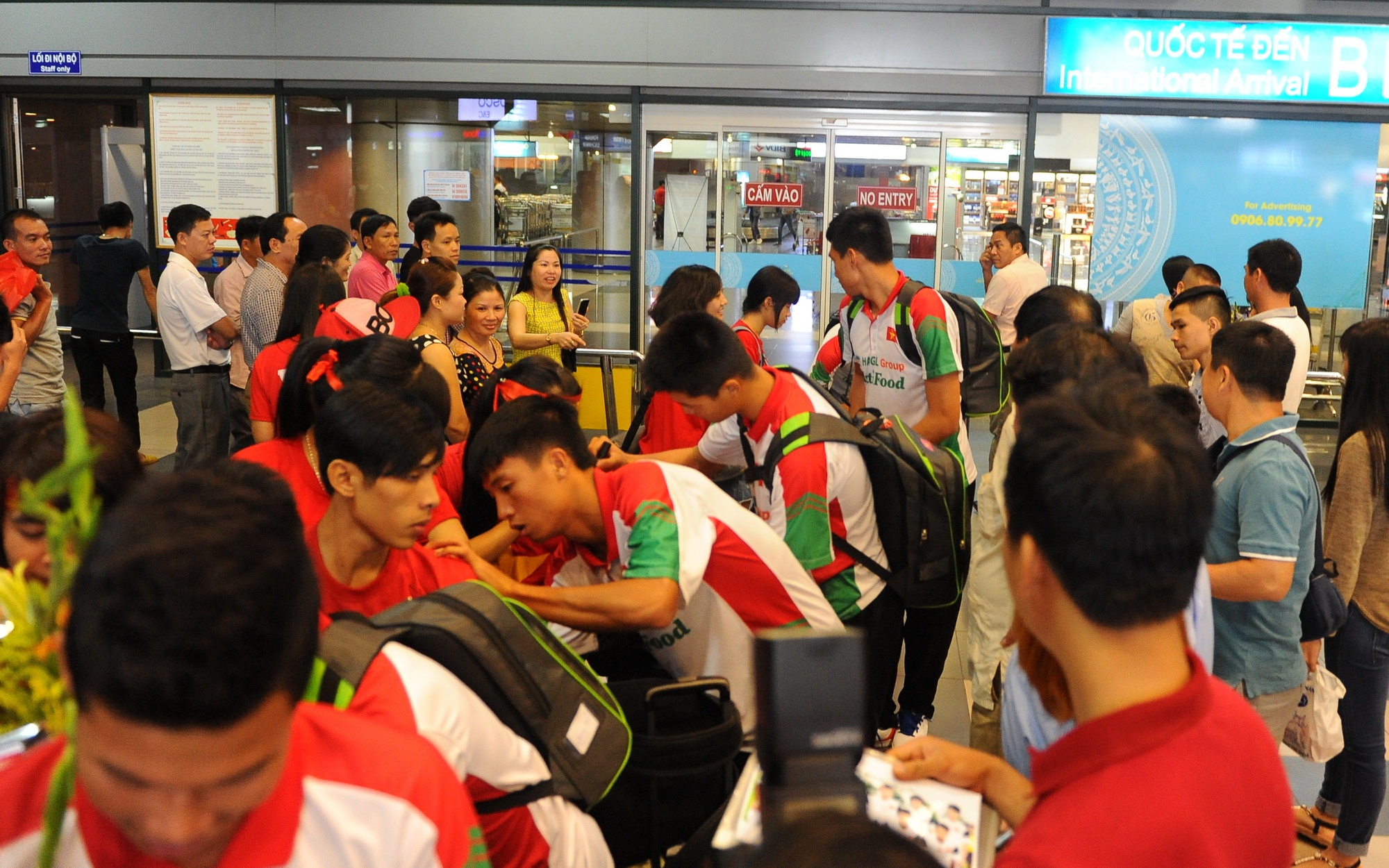 | Đông Triều là cầu thủ đầu tiên bước ra khỏi khu vực làm thủ tục hải quan. Anh lập tức bị người hâm mộ vây quanh xin chữ ký. |