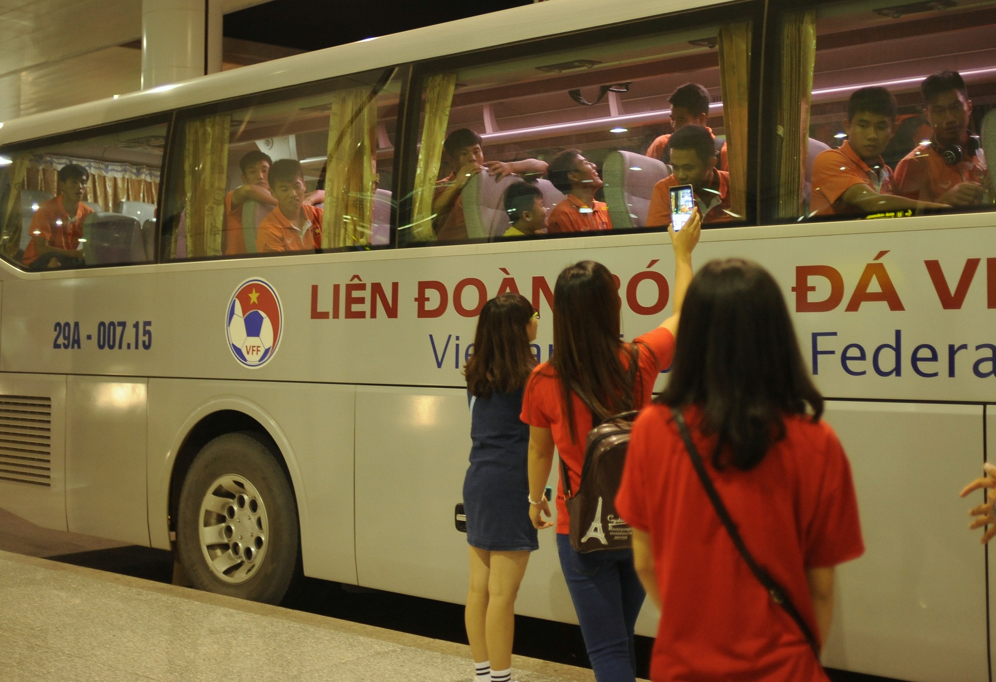 | Nhóm fan nữ di chuyển bằng xe bus từ Hà Nội lên sân bay Nội Bài. Họ tiếc nuối khi phải nói lời chia tay các cầu thủ U19 Việt Nam để về kịp chuyến xe bus cuối cùng lúc 22h30 tối 7/10. |