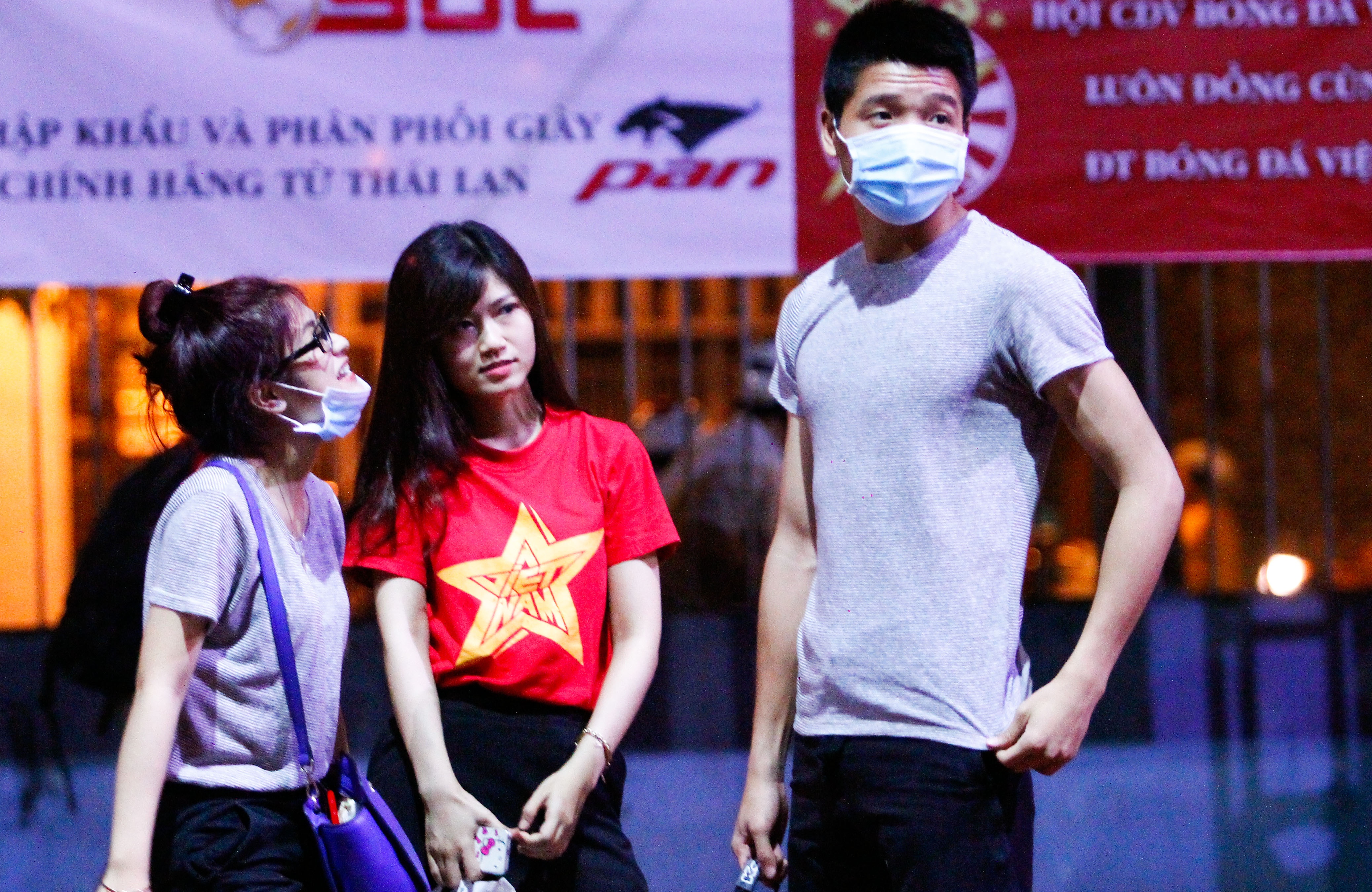 | Thủ môn Phí Minh Long cũng tham gia cùng các cổ động viên tại Sài Gòn, nhưng anh bịt khẩu trang và đứng một góc sân để theo dõi trận đấu. |