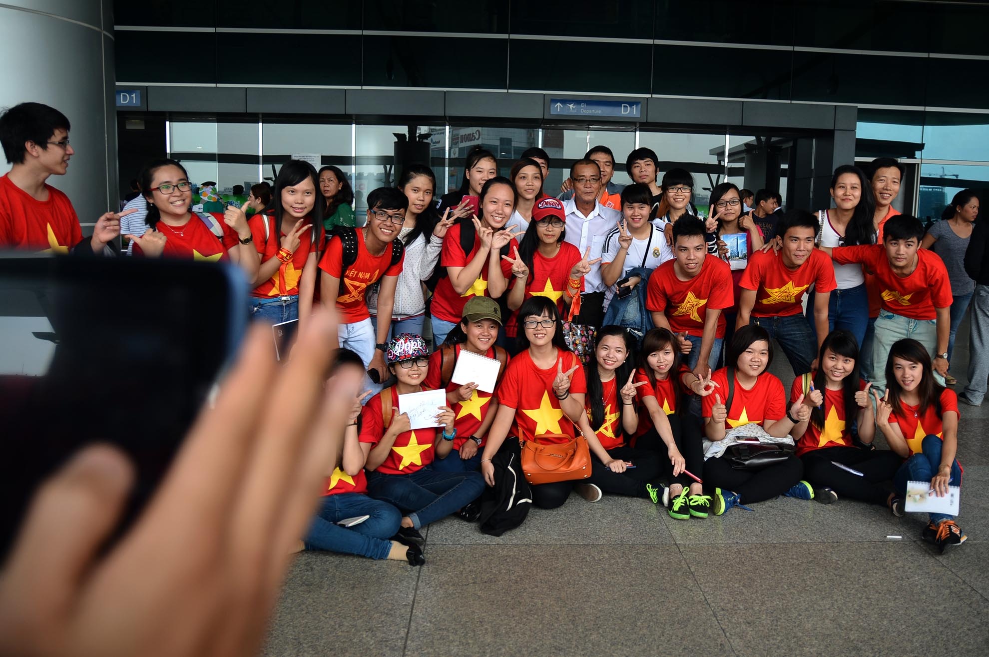 | Các cổ động viên cùng nhau chụp hình lưu niệm trong lần tiễn các cầu thủ đi thi đấu. Tất cả đều tỏ ra vui sướng và khoe chữ ký vừa xin được từ các cầu thủ. |