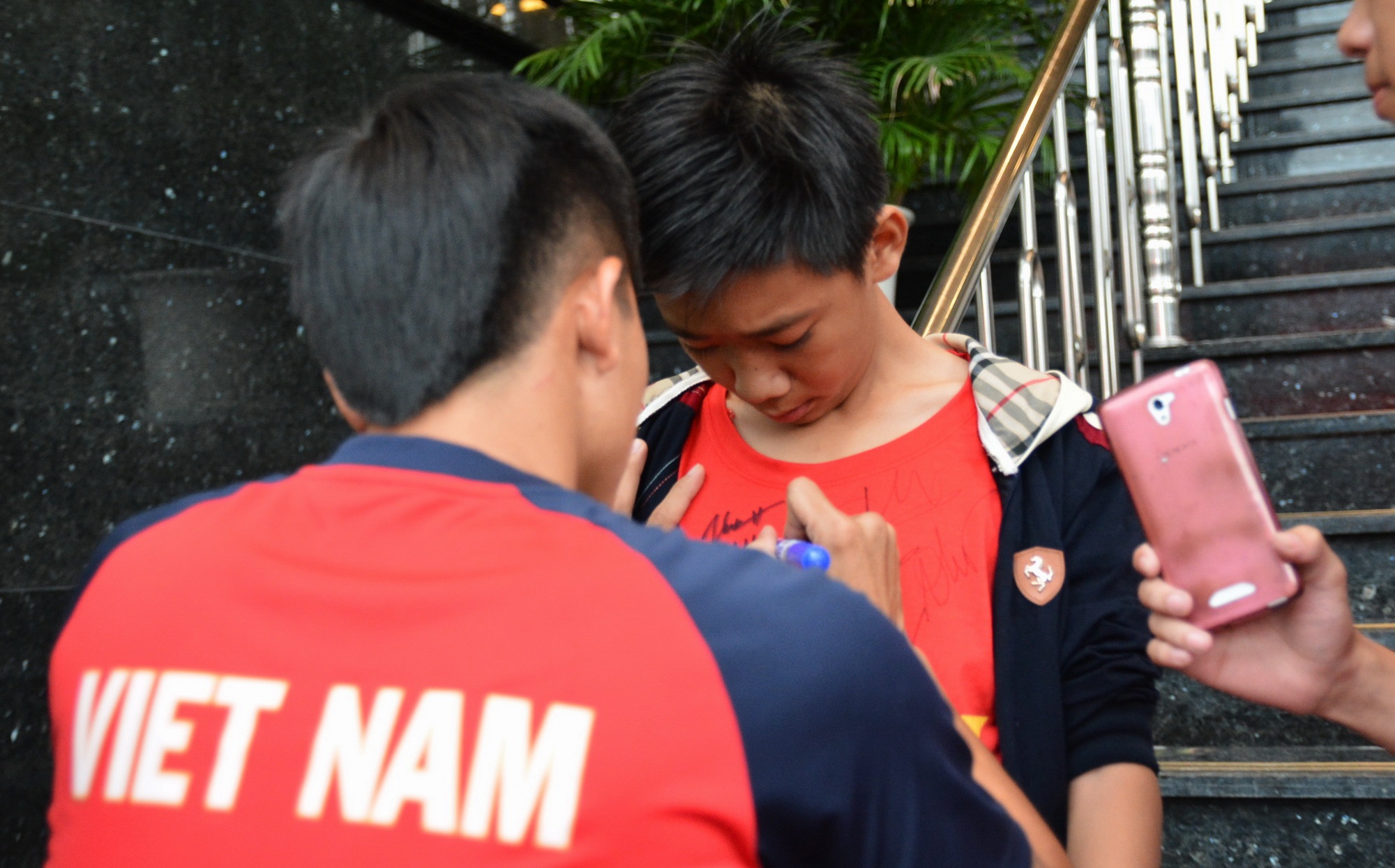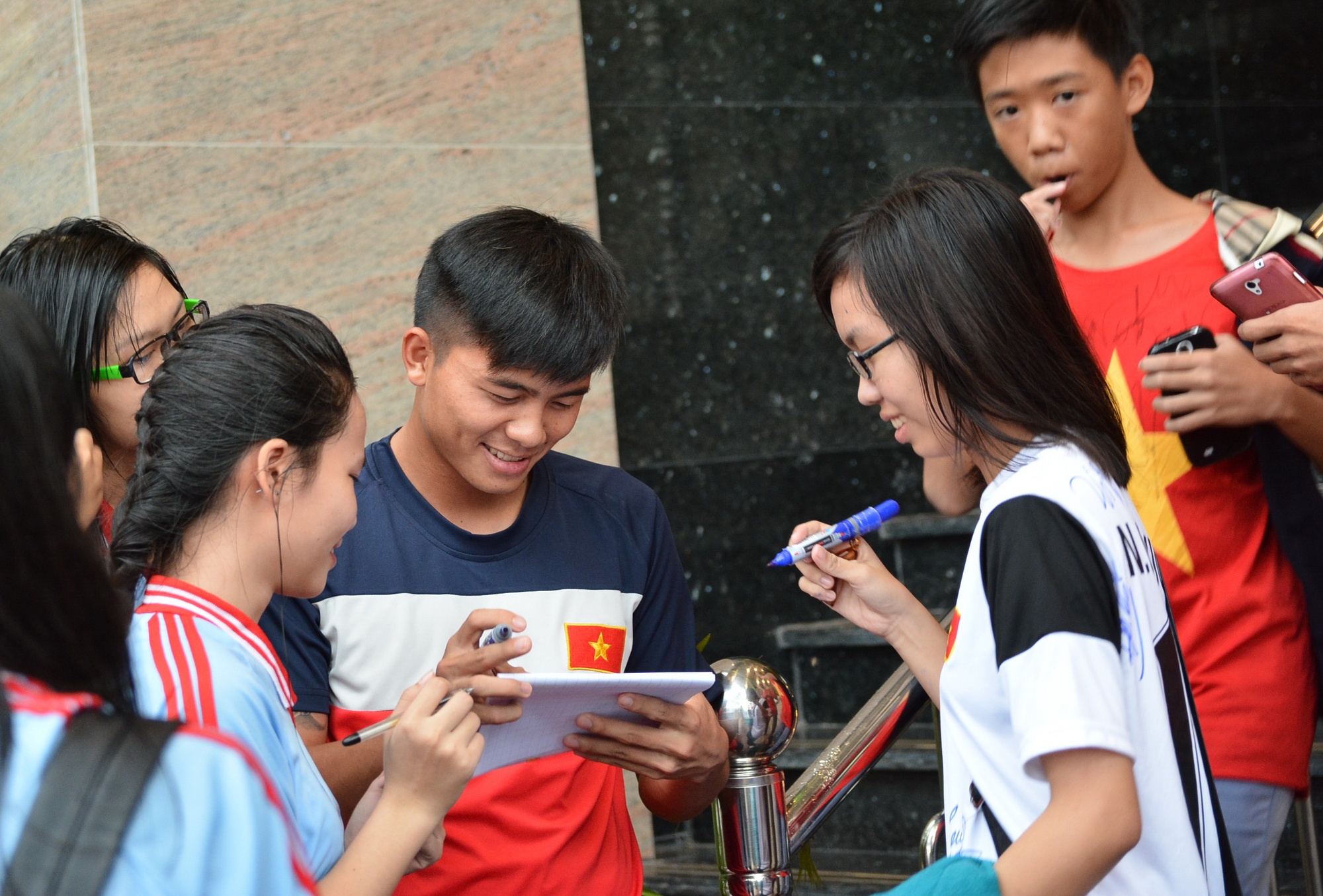 Chiều nay (27/10), trong khi các đồng đội đi bơi để giải trí thì trung vệ Mạnh Hùng chọn phương án dạo phố cùng bạn bè để có tâm trạng thoải mái nhất chuẩn bị cho trận đấu tranh hạng ba gặp U21 Malaysia. Fan nữ có mặt trước cửa khách sạn Fortuneland đã vây quanh tuyển thủ U21 Việt Nam để xin chữ ký và chụp hình lưu niệm cùng.
