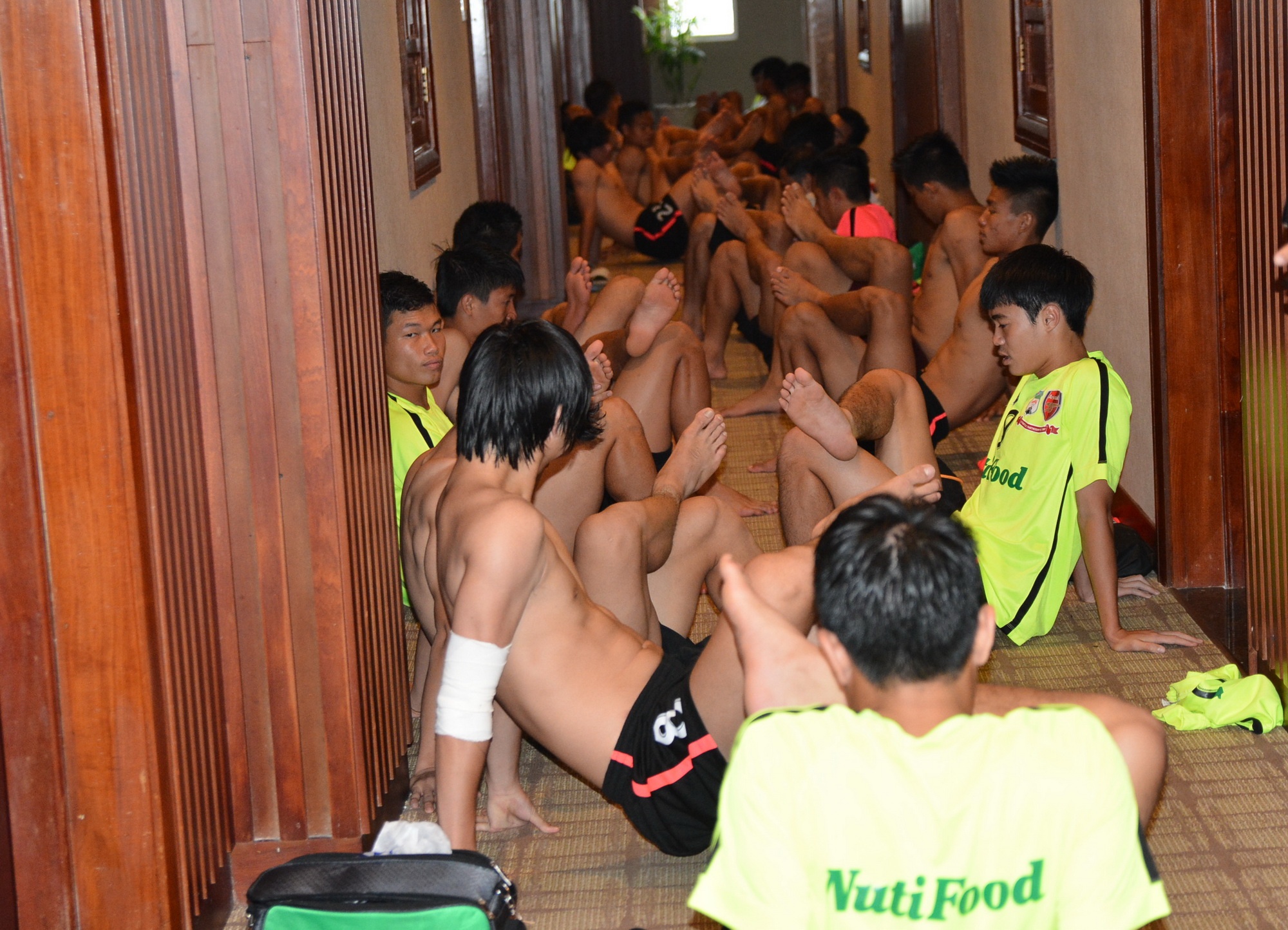 | Cầu thủ U19 HAGL căng cơ ở hành lang khách sạn sau buổi tập. |